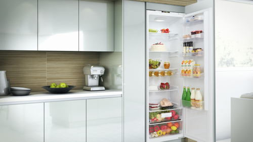 An integrated fridge is built into your kitchen cabinets and hidden behind a matching cupboard door for a sleek, seamless look. It keeps your food fresh while blending in perfectly with your kitchen’s design. It’s a great space-saving option, offering all the benefits of a regular fridge without taking up extra room or disrupting your kitchen’s style.