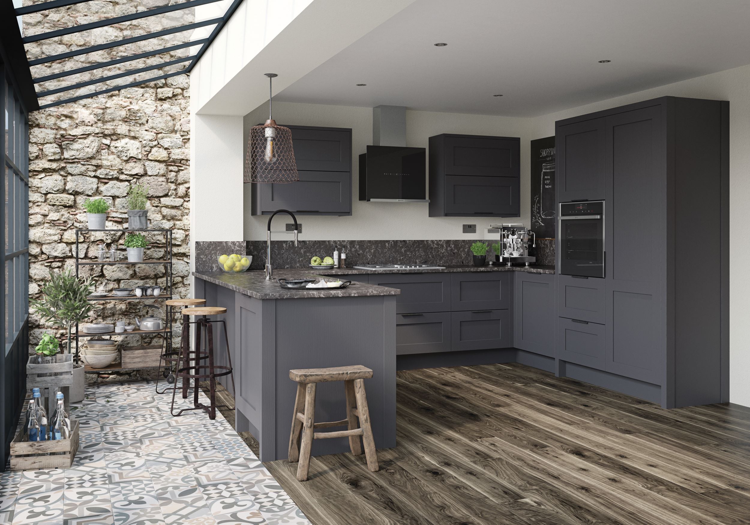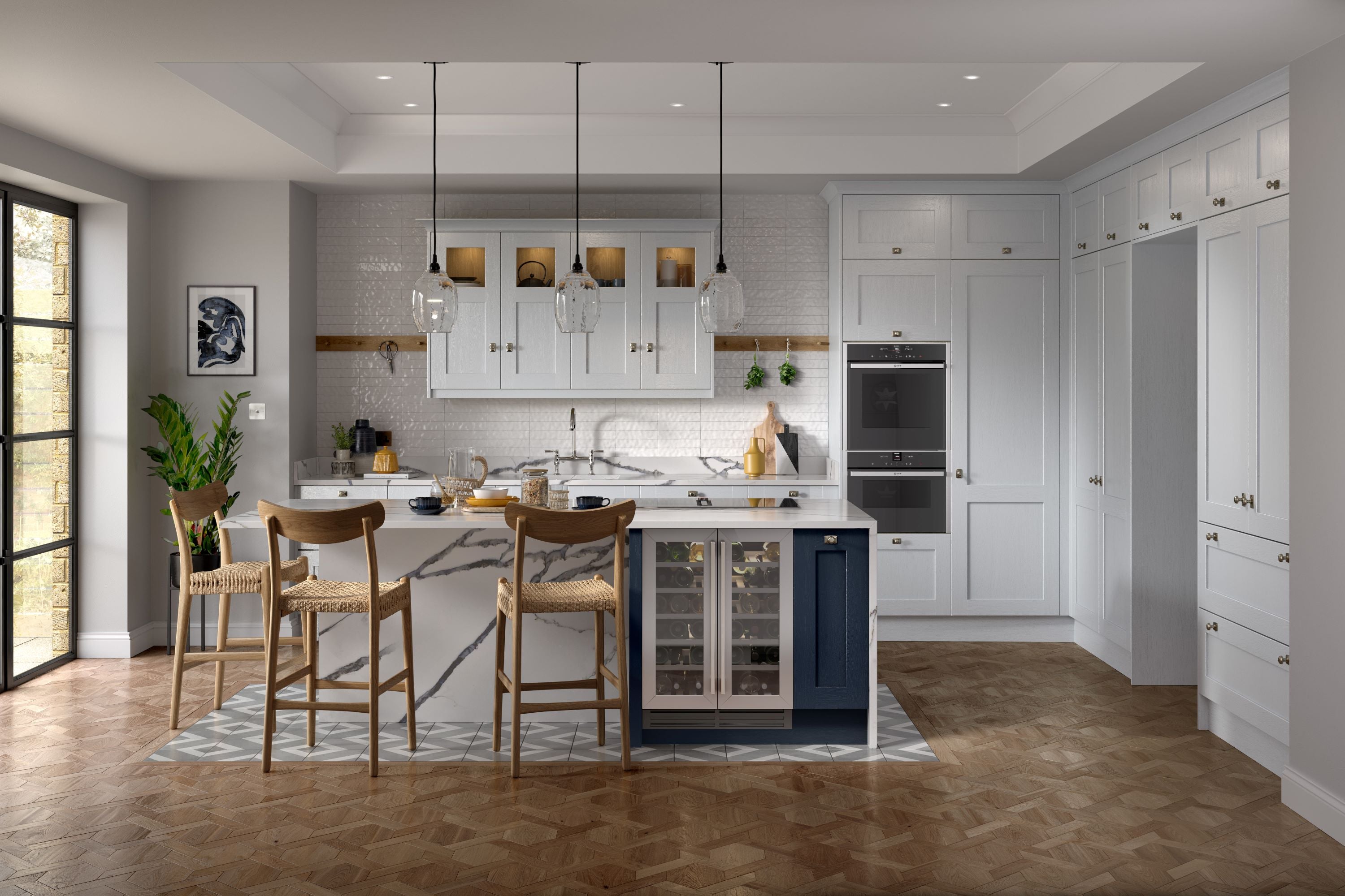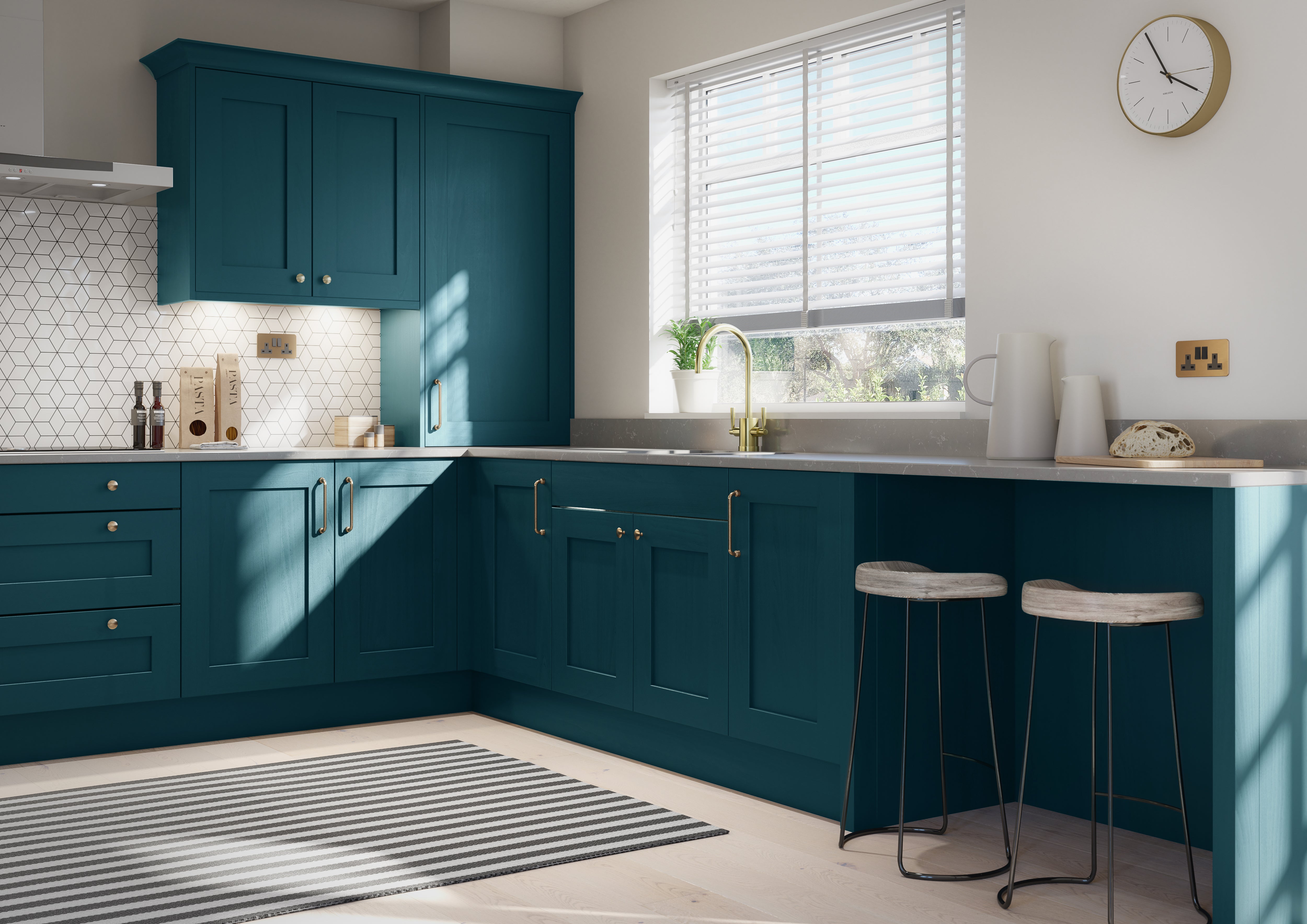 With a simple frame, and distinctive handles, this look blends both the modern and traditional aesthetics perfectly. A landscape inspired colour palette can help create a classic kitchen feel.