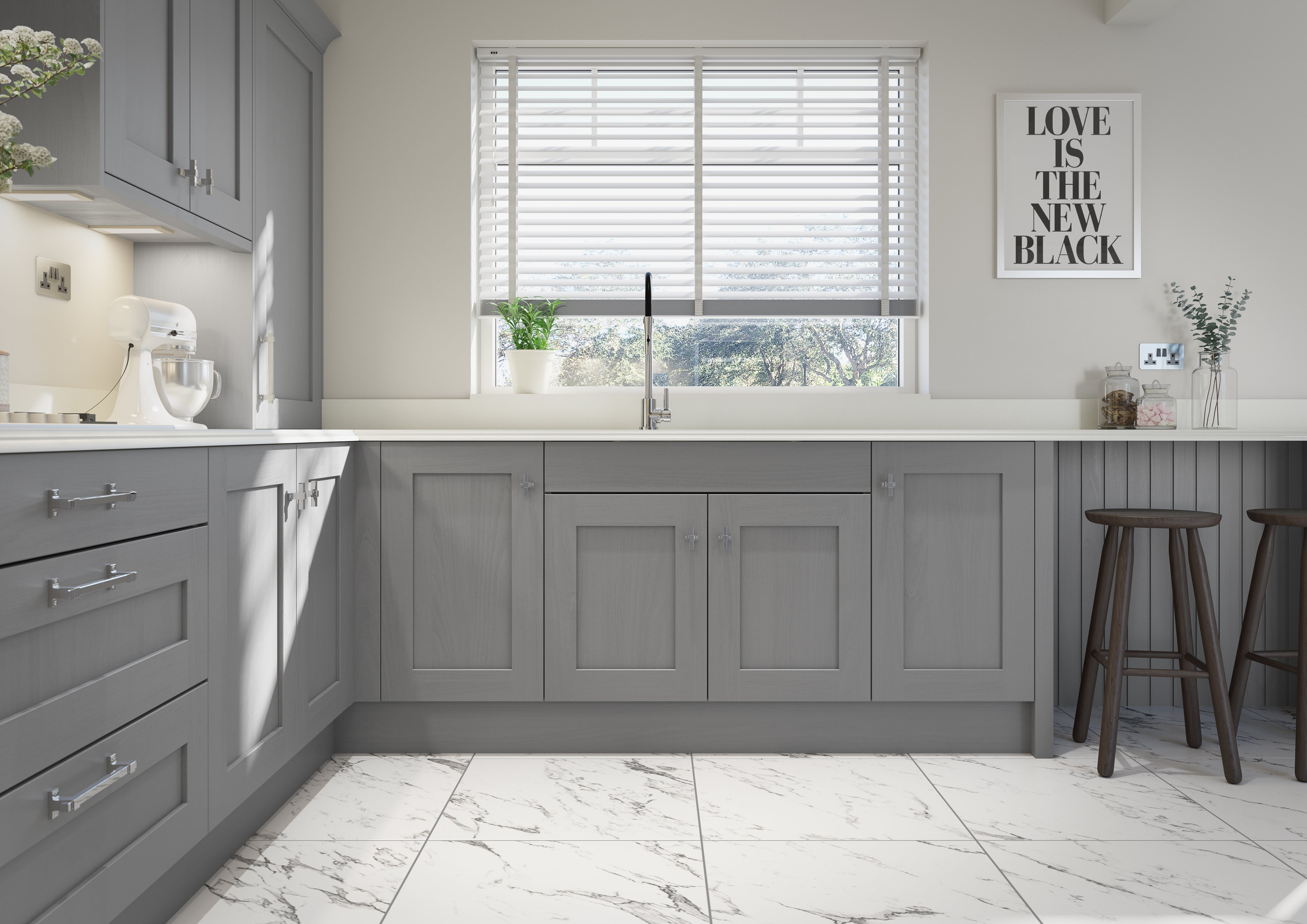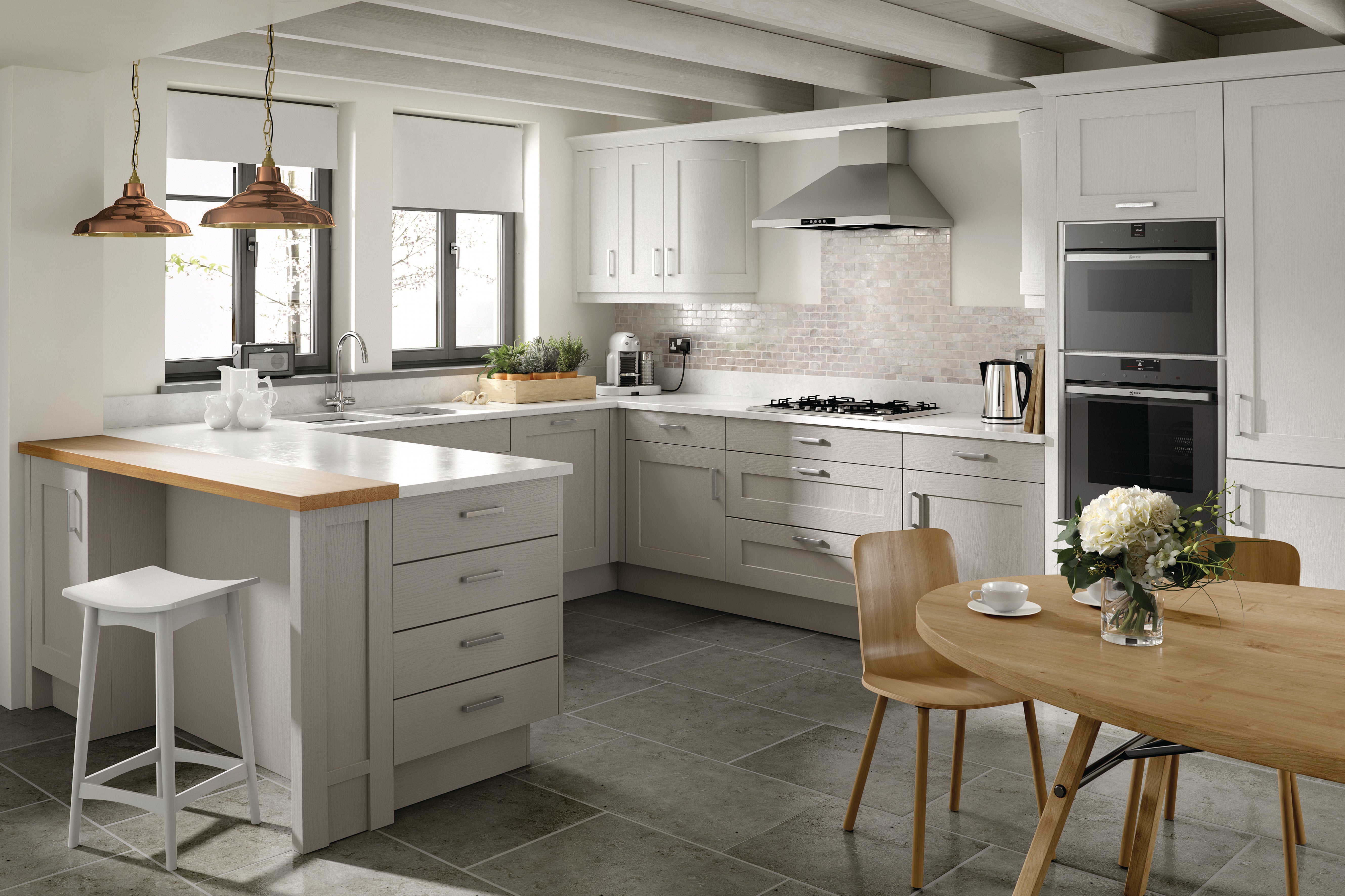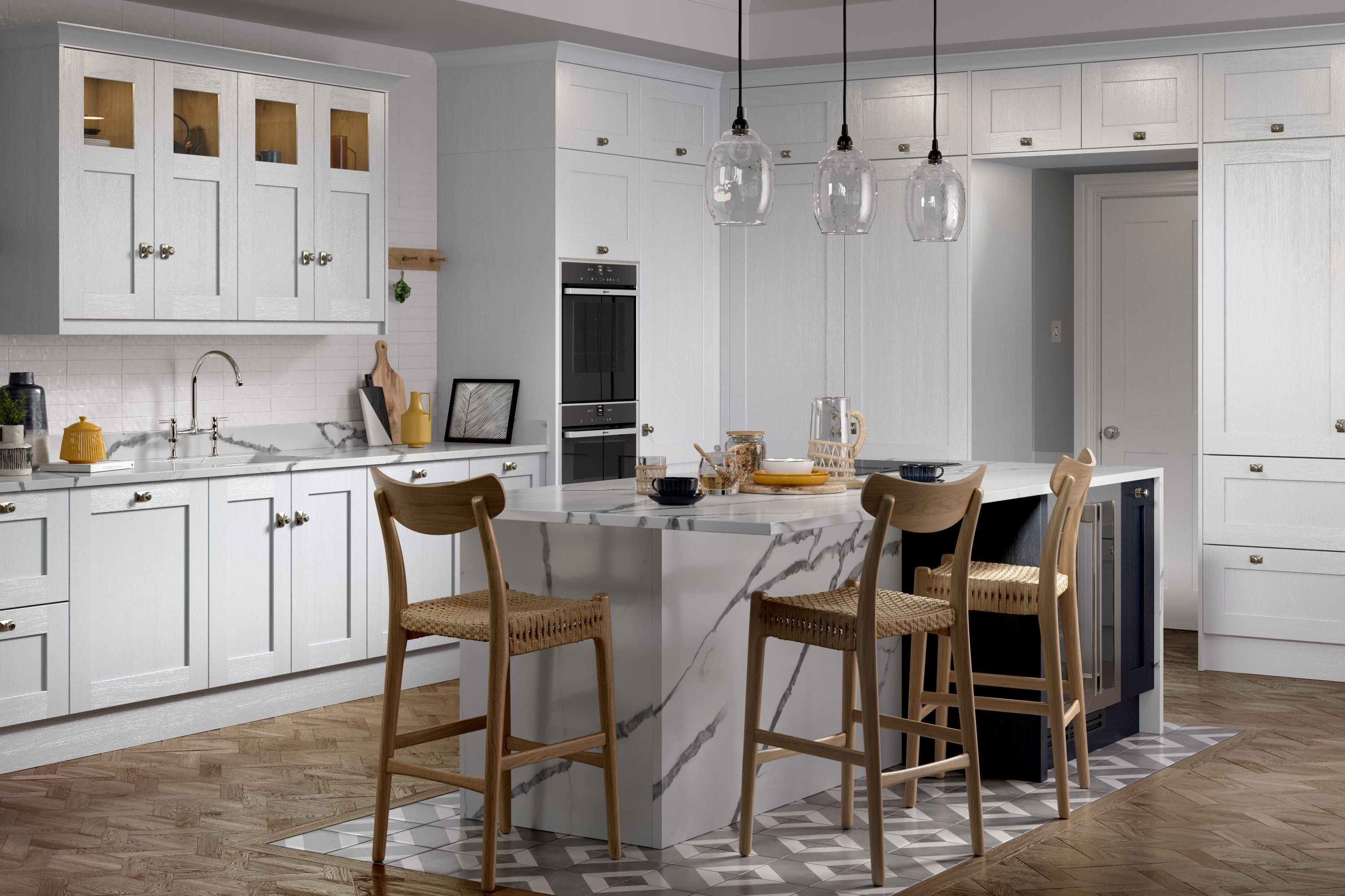 With a simple frame, and distinctive handles, this look blends both the modern and traditional aesthetics perfectly. A landscape inspired colour palette can help create a classic kitchen feel.