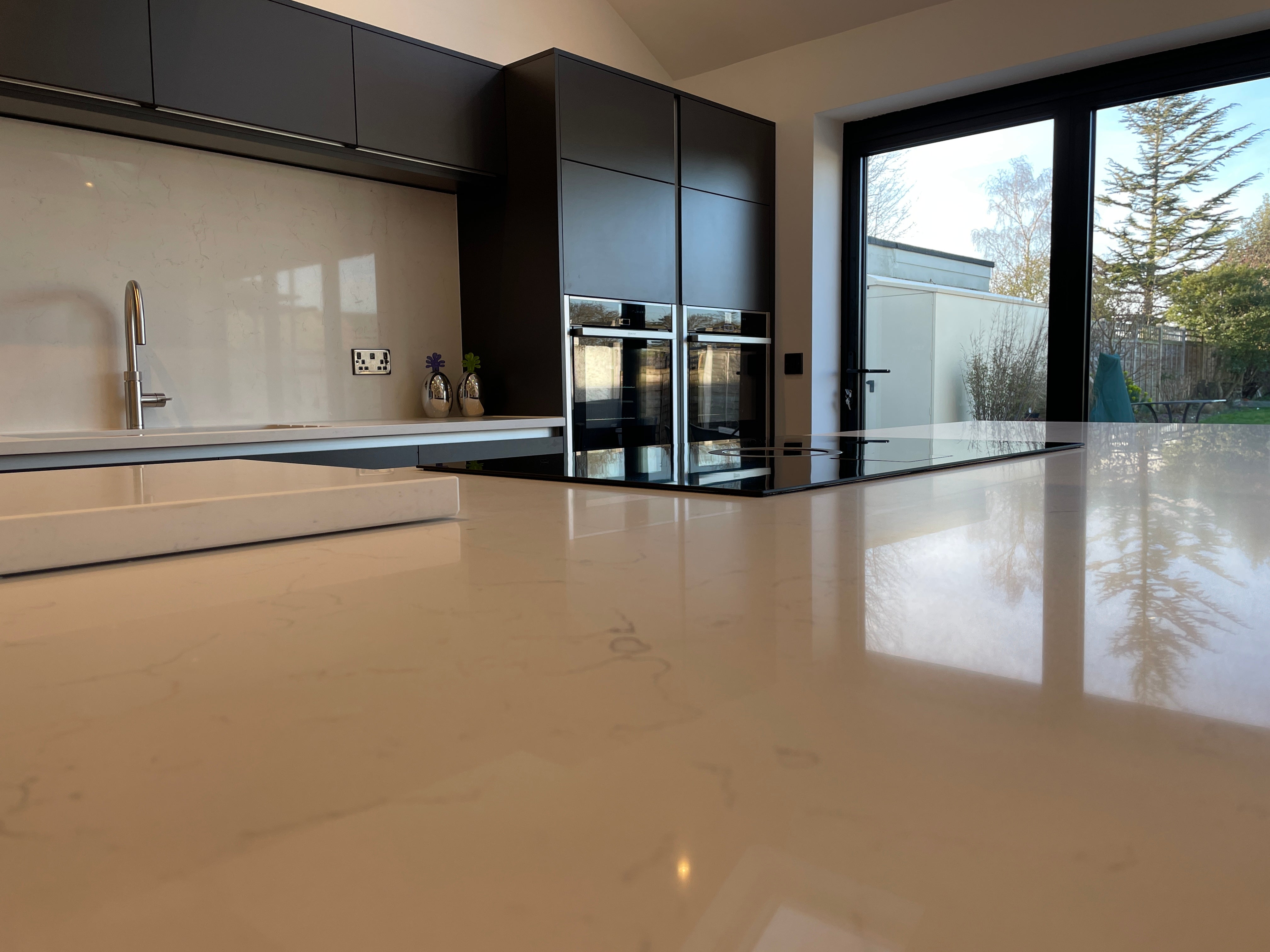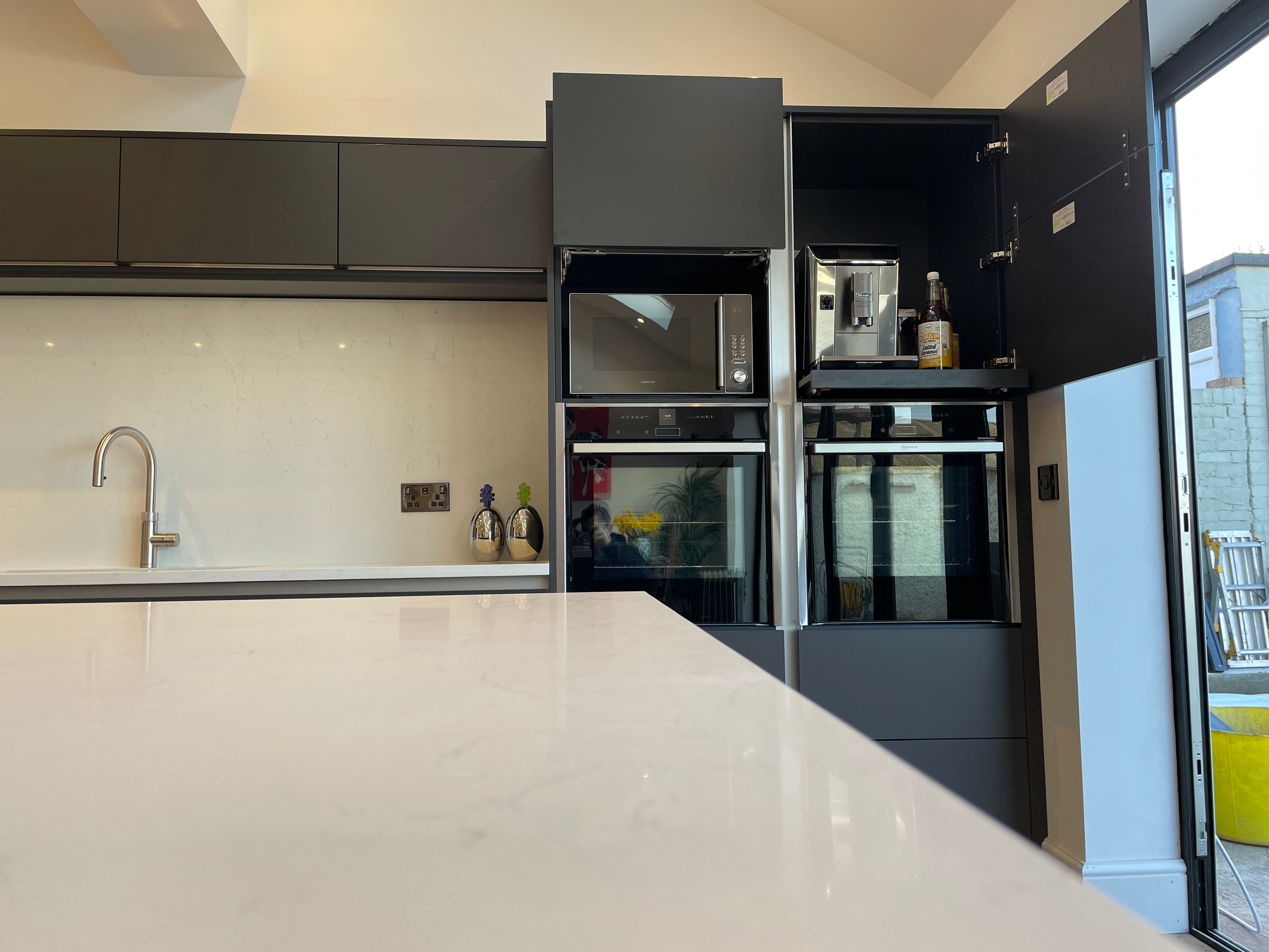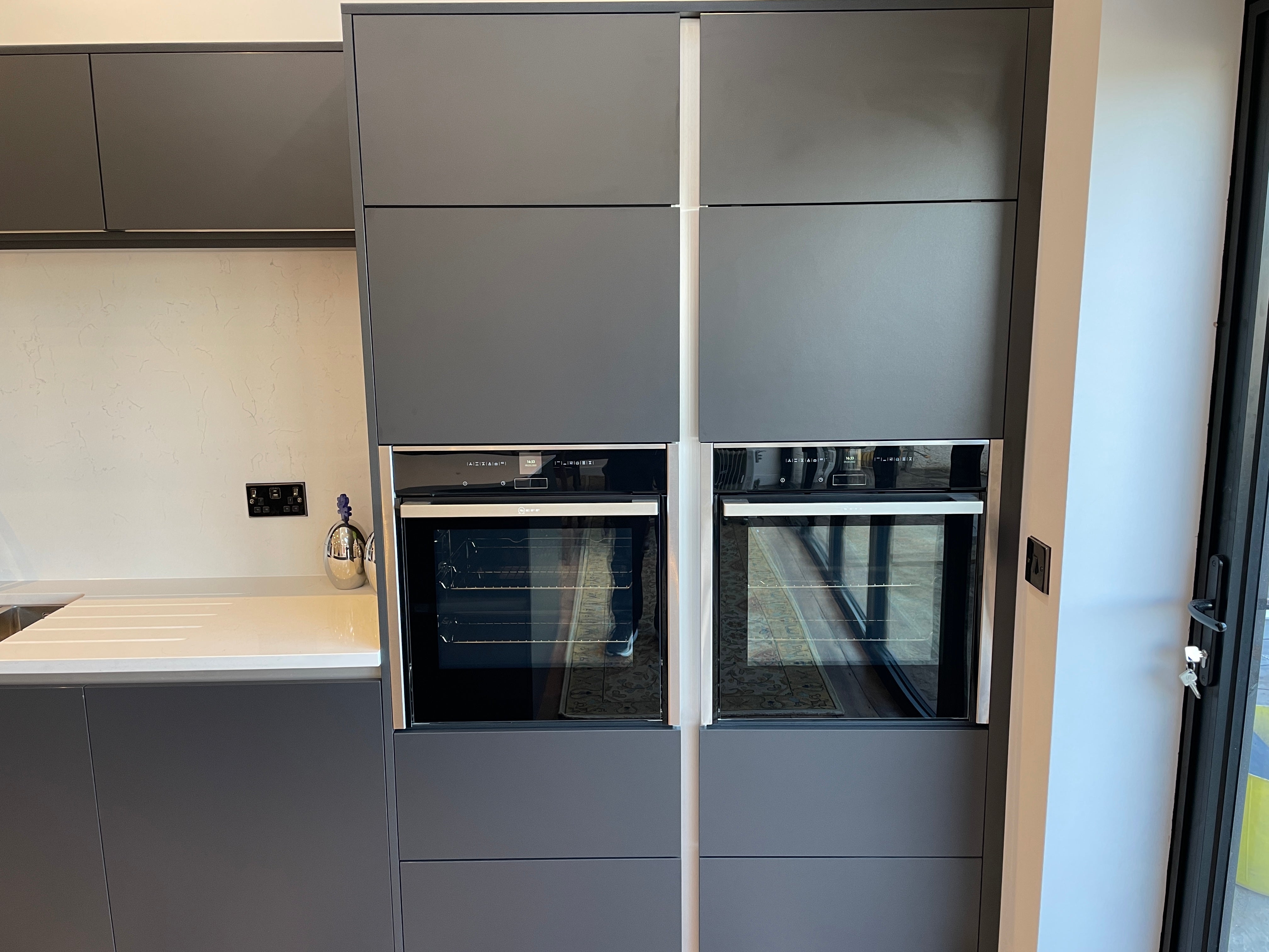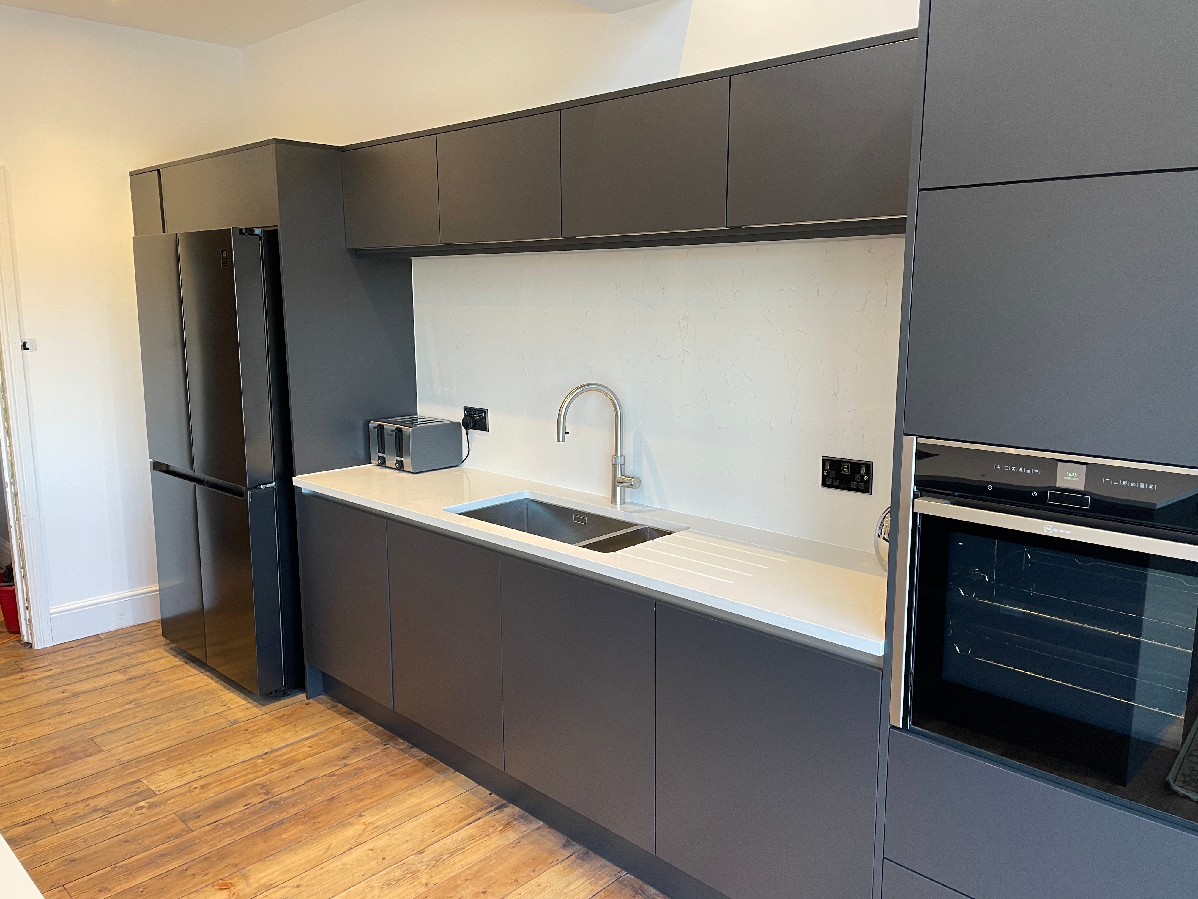 Nestled in the heart of Park Avenue, Eastbourne, our latest kitchen design masterpiece showcases a harmonious blend of style, functionality, and innovation. Drawing inspiration from the Artisan Reflections range, we adorned the space with striking Graphite MFC doors, lending a contemporary allure to the kitchen. True handle less design, accentuated with sleek aluminium detailing, adds a touch of modern sophistication while ensuring seamless integration with the overall aesthetic.