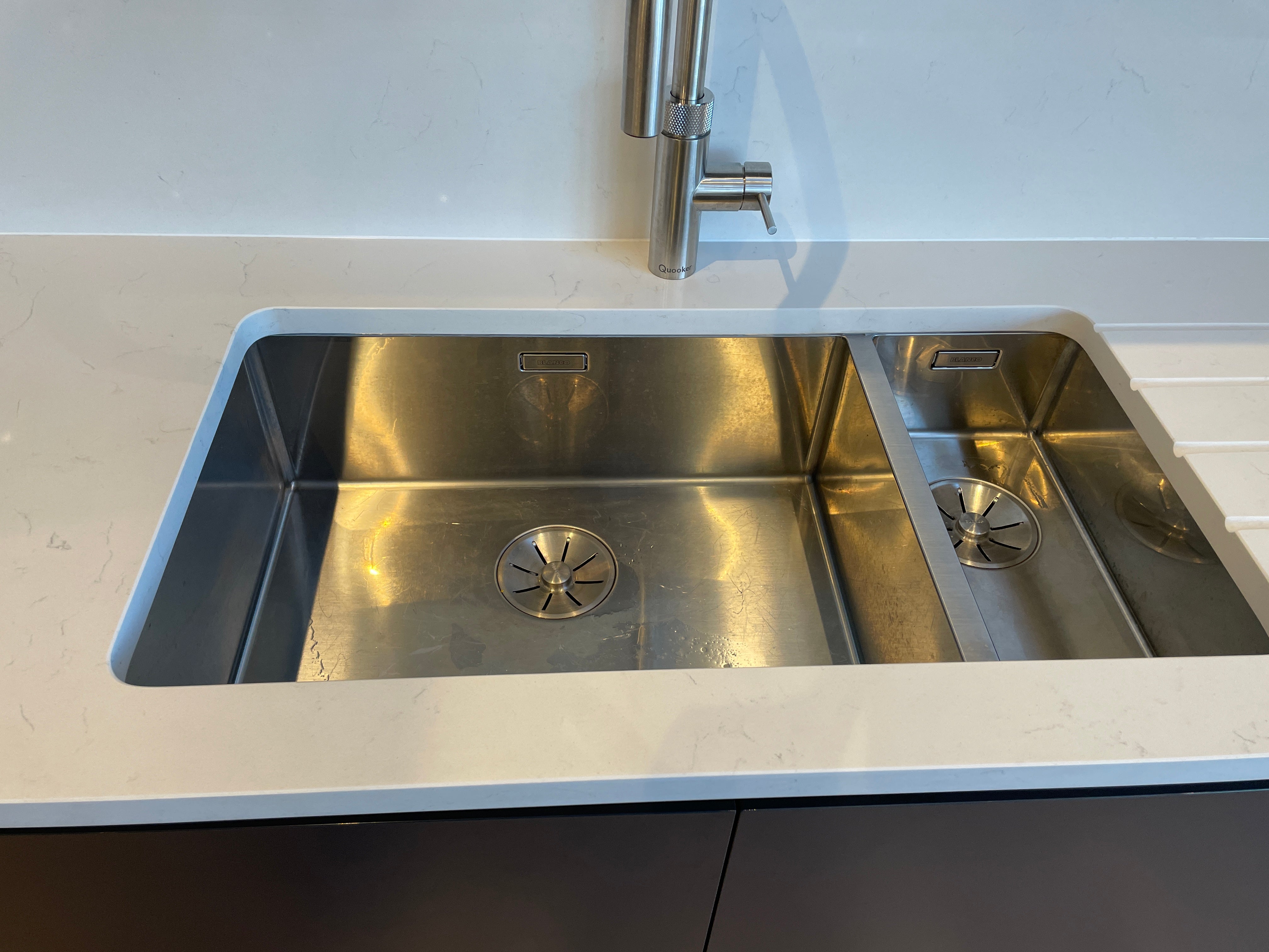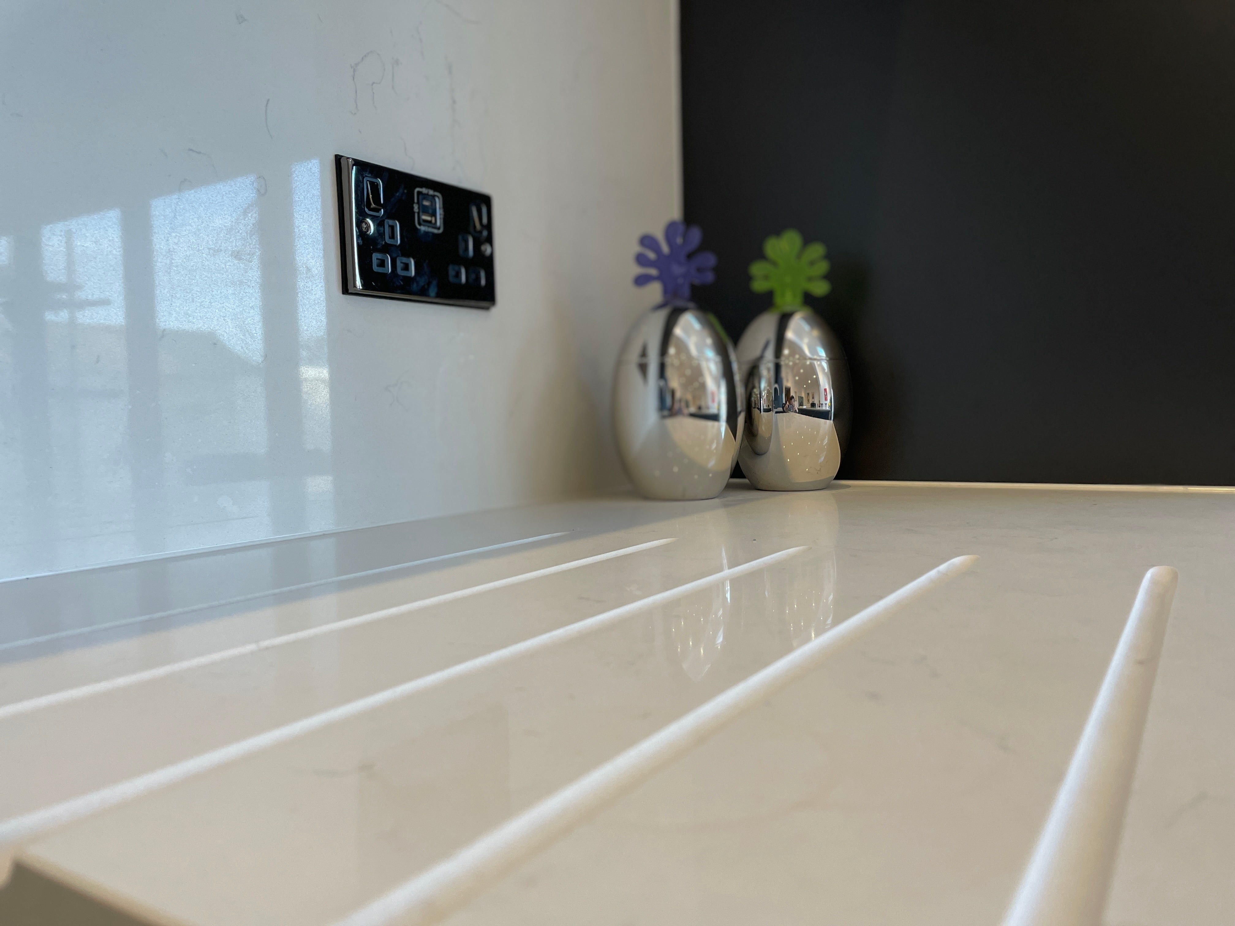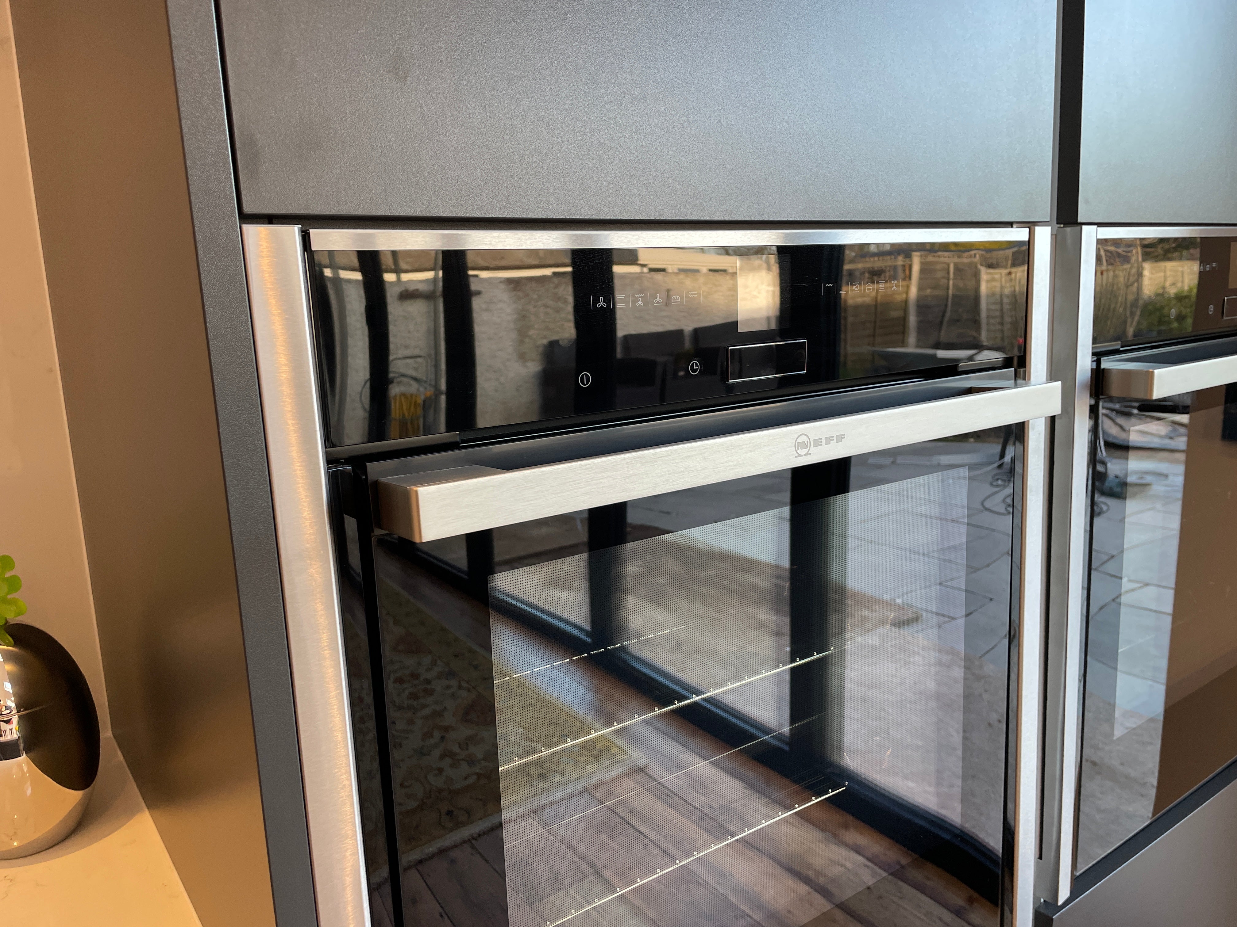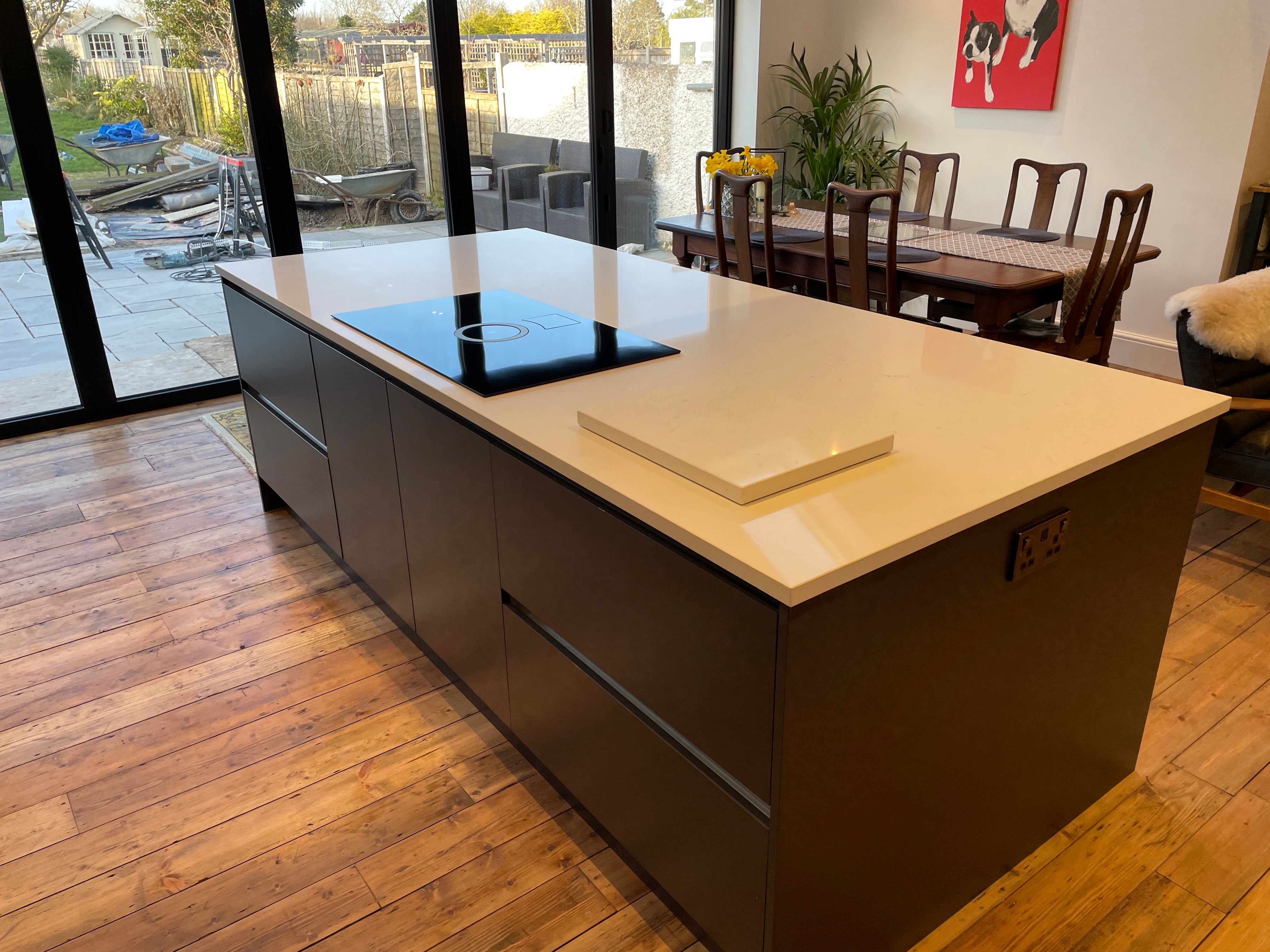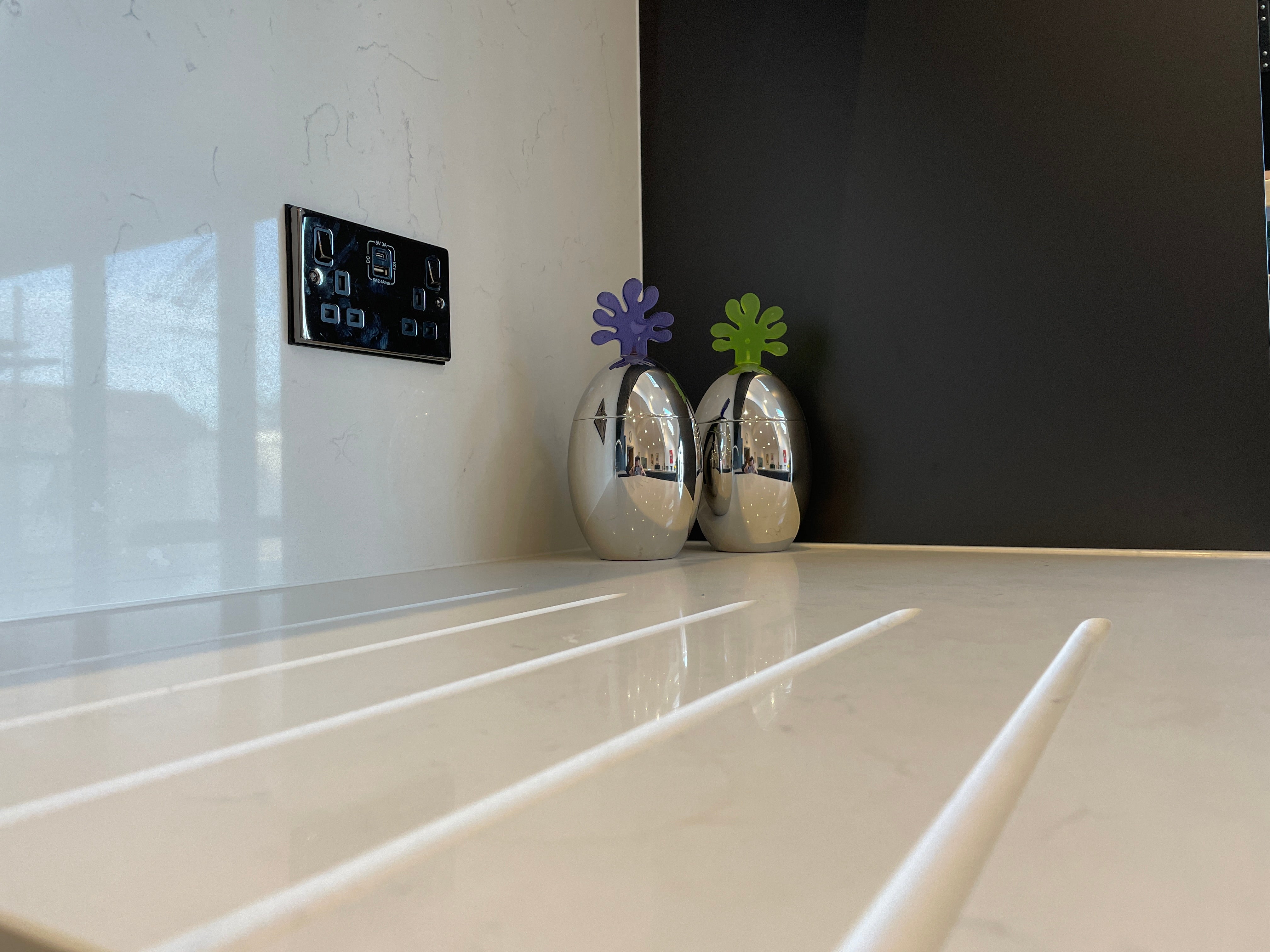 Nestled in the heart of Park Avenue, Eastbourne, our latest kitchen design masterpiece showcases a harmonious blend of style, functionality, and innovation. Drawing inspiration from the Artisan Reflections range, we adorned the space with striking Graphite MFC doors, lending a contemporary allure to the kitchen. True handle less design, accentuated with sleek aluminium detailing, adds a touch of modern sophistication while ensuring seamless integration with the overall aesthetic.
