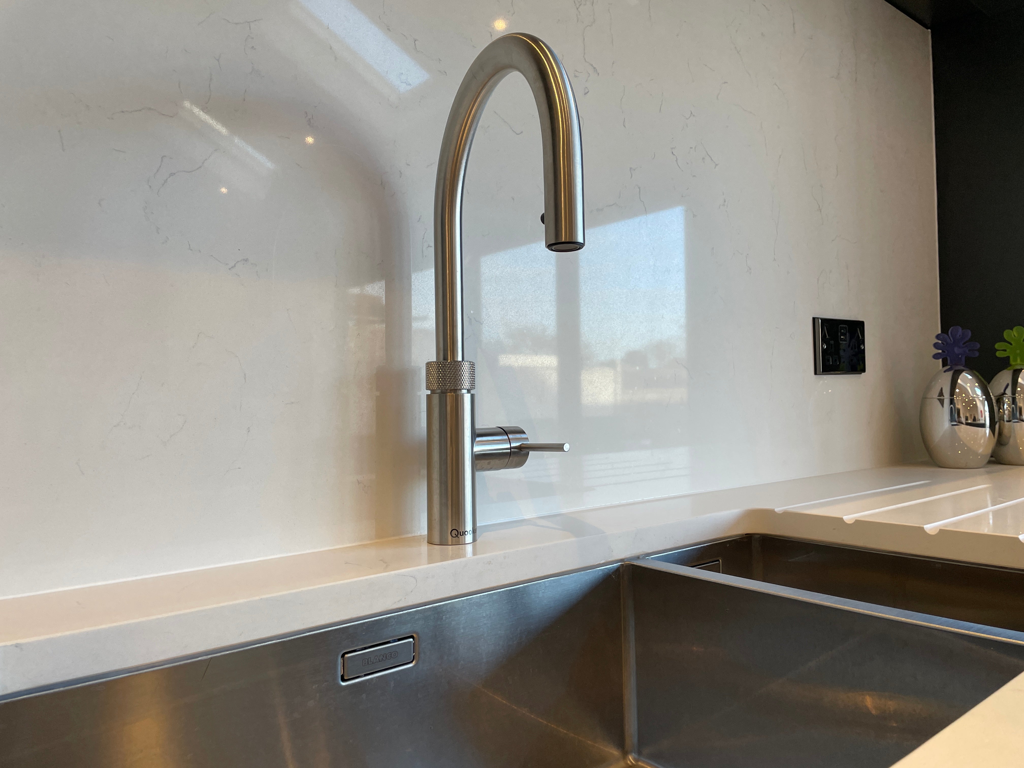 Adding to the convenience and luxury, the Quooker Flex stainless steel tap delivers instant boiling water at the touch of a button, streamlining kitchen tasks and enhancing efficiency. Completing the ensemble, the Elica vented induction hob offers cutting-edge technology and sleek design, providing an exceptional cooking experience for culinary enthusiasts.