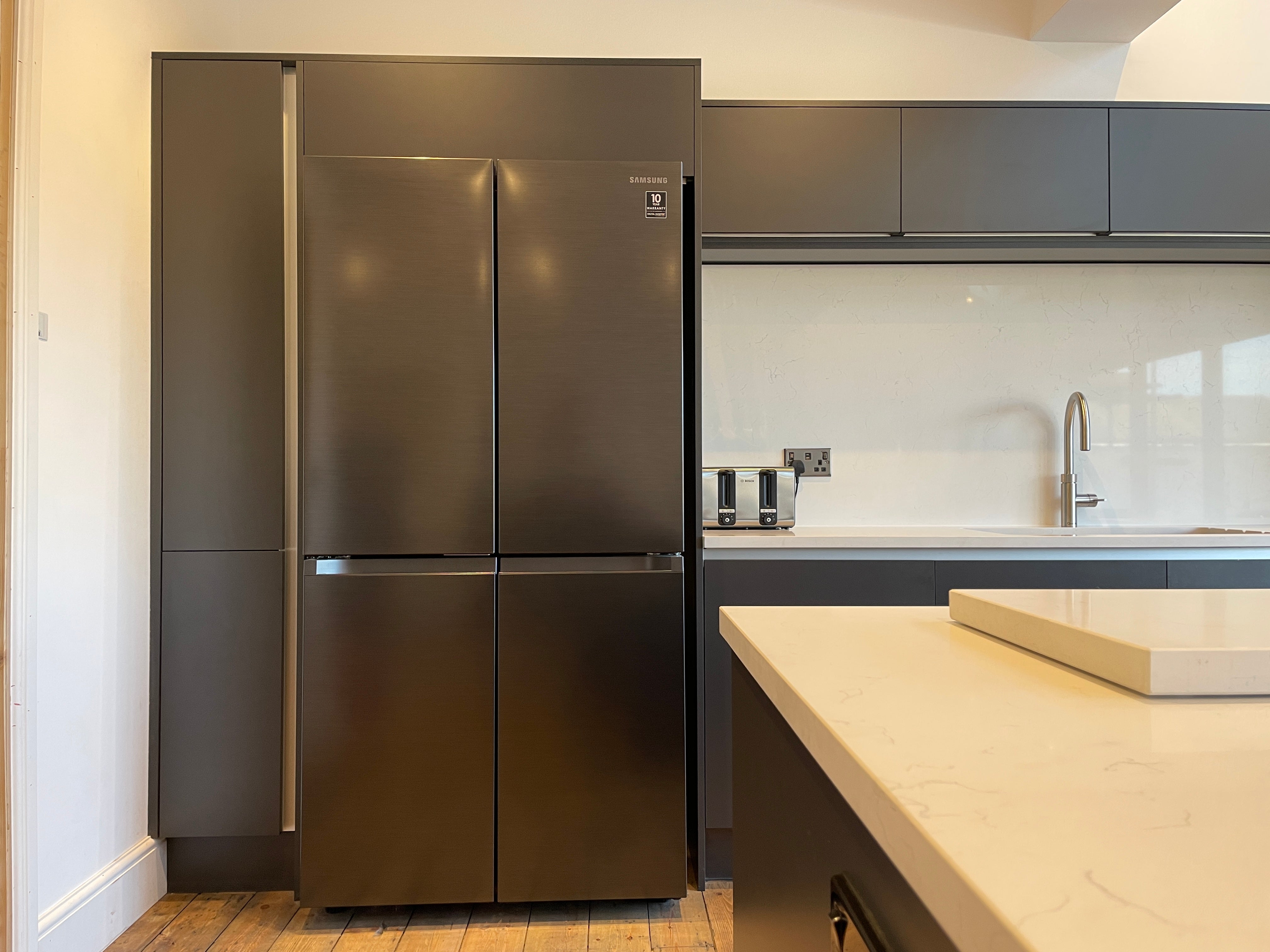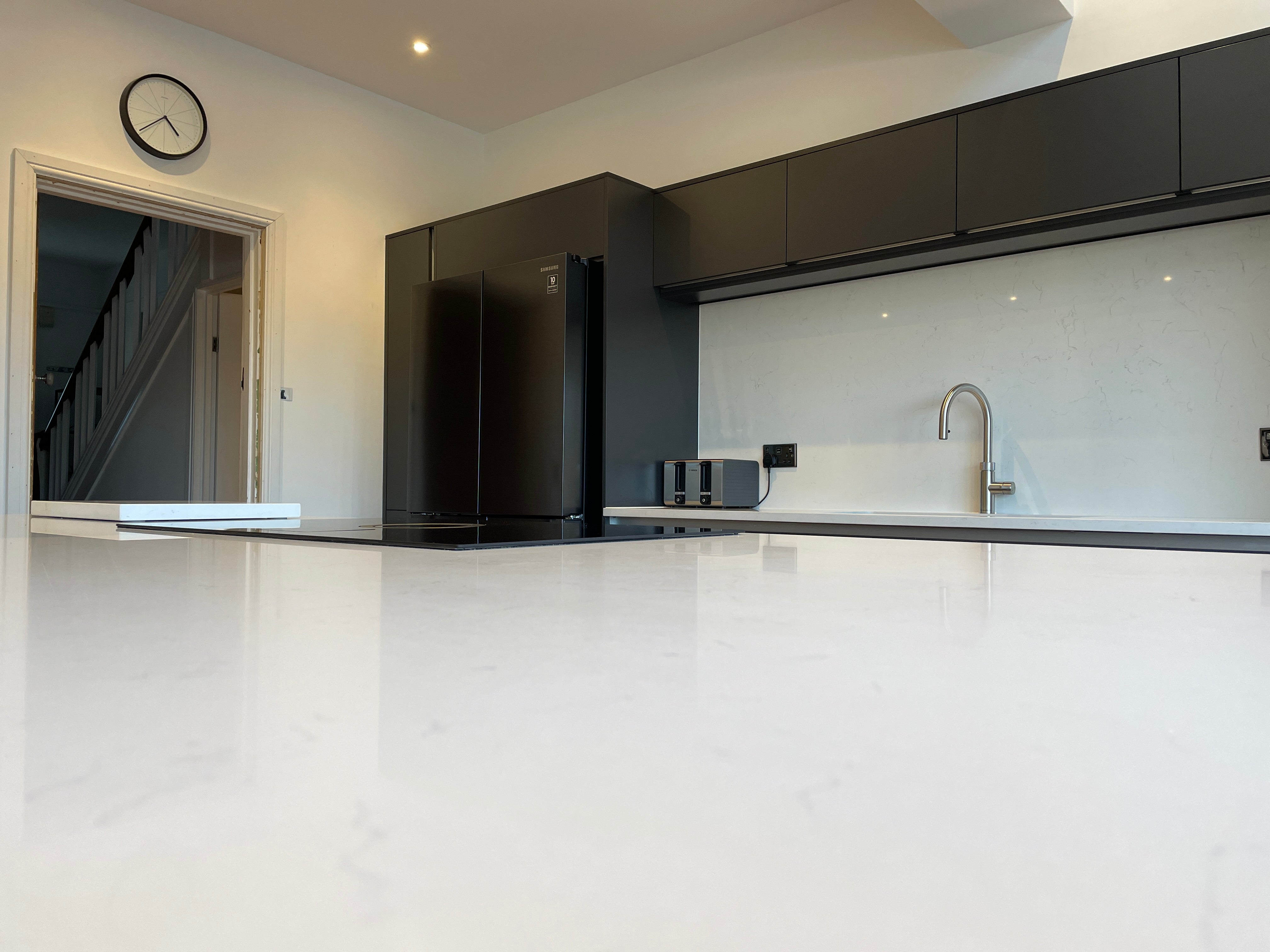 The centerpiece of the kitchen is the luxurious quartz worktop, offering both durability and elegance, providing an ample surface for culinary creations and gatherings alike. Enhancing the culinary experience, we incorporated top-of-the-line appliances such as the Samsung American fridge freezer, Neff oven, and dishwasher, ensuring optimal performance and efficiency.