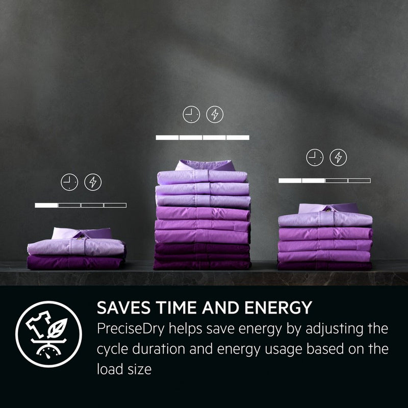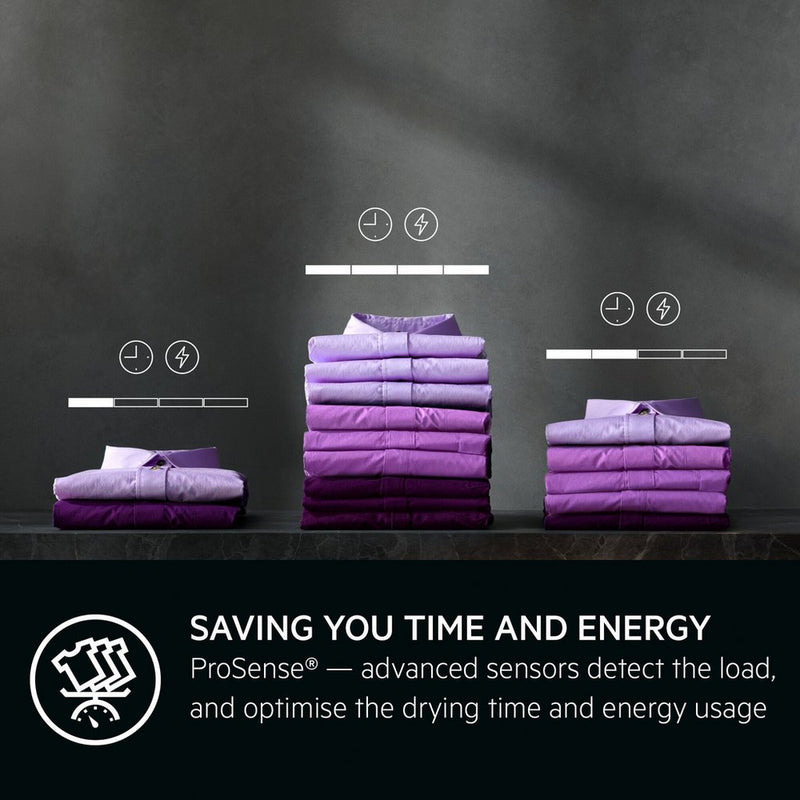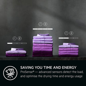 With a generous 8kg capacity, this tumble dryer is perfect for large families or those who have a lot of laundry to tackle. The innovative heat pump technology ensures gentle and energy-efficient drying, while the ProSense technology automatically adjusts the drying time and energy consumption based on the load size.
