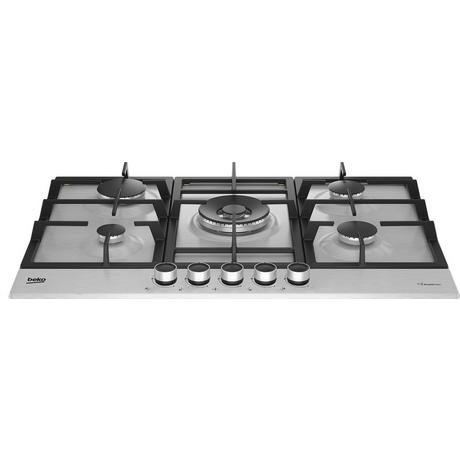 In Stainless Steel This his hob features 5 cooking zones, including a double ring wok burner, and the Practi Clean coating for easier cleaning. The gas hob is made from stainless steel with cast iron pan supports and an automatic ignition system that will turn on the gas as soon as you light it up.