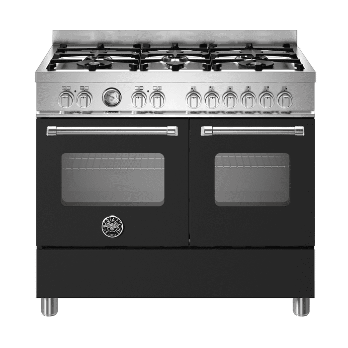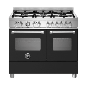 The Bertazzoni MAS106L2ENEC Dual Fuel Range Cooker gives you great versatility and style to your kitchen, the main electric oven has 11 functions, from convection, baking and grilling to warming and features a thermometer on control panel.