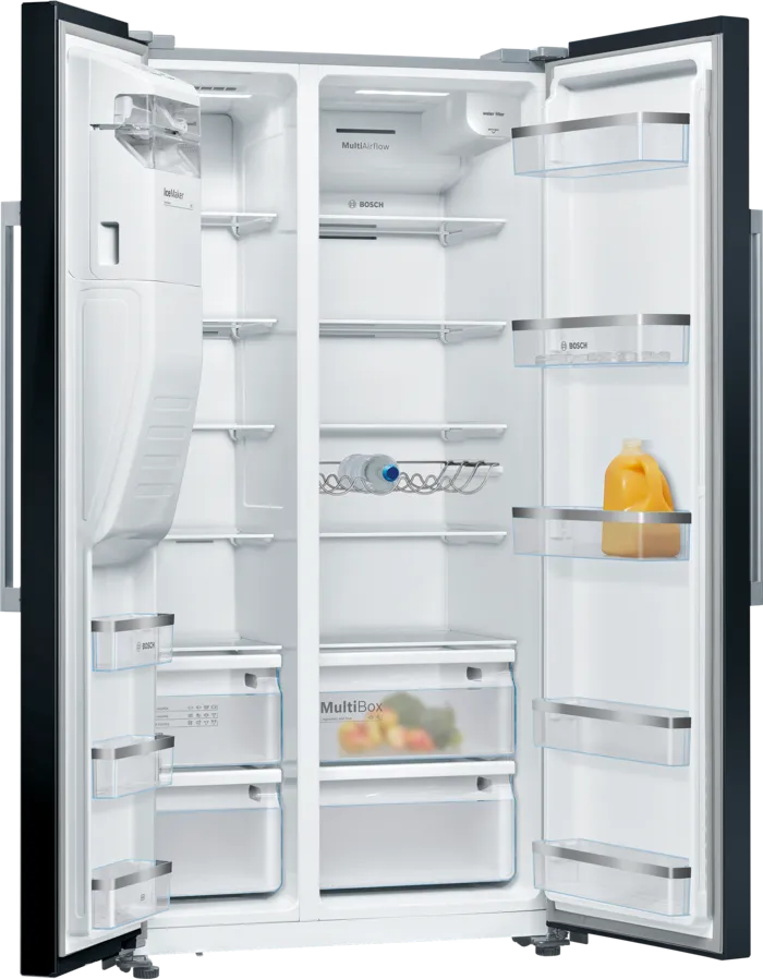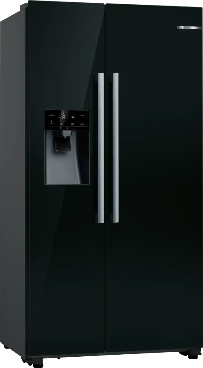Upgrade your kitchen with the Bosch KAD93ABEP Series 6 American Fridge Freezer, designed to deliver premium cooling performance and contemporary style. With its sleek black finish and side-by-side doors, this spacious appliance makes a striking statement while offering easy access to all your fresh and frozen essentials. Perfect for families or avid cooks, its generous full capacity of 562-litre capacity means you’ll never be short on storage.