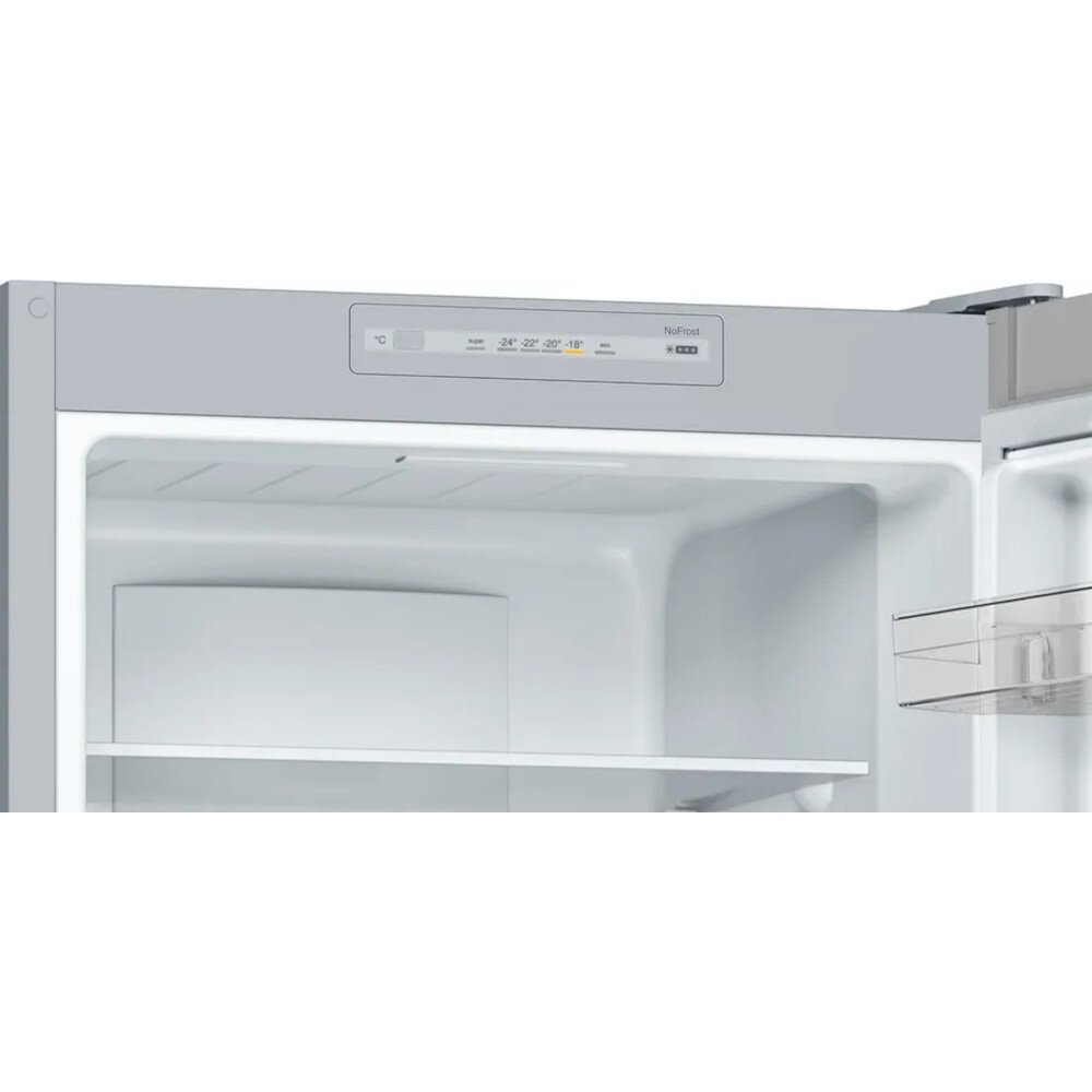 This fridge freezer is equipped with Bosch's innovative NoFrost technology, which prevents ice build-up and eliminates the need for manual defrosting.