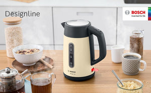 The Bosch TWK4P437GB 1.7 Litre Traditional Kettle in Cream is a stylish and functional addition to any kitchen. With a generous 1.7 litre capacity, this kettle is perfect for making multiple cups of tea or coffee at once, making it ideal for families or entertaining guests.