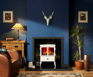 The Dimplex Auberry is now available to order from DB Domestics. A twist on a traditional classic, the stylish off-white matt finish is ideal to suit changing interior colour schemes. The realistic Optimyst flame effect uses established ultrasonic technology to create an ultra-fine water mist that rises up and works with the under fuel bed lighting to give a fully three dimensional fire effect and a fully concealed 2kW heater which can be operated by remote control.