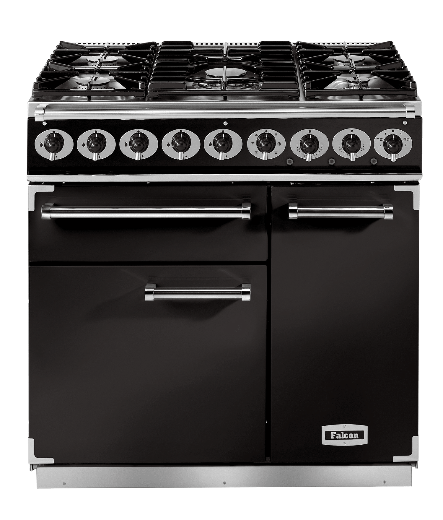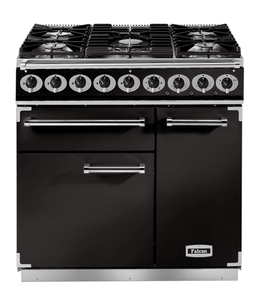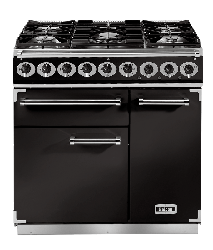 The Rangemaster Falcon Deluxe 90cm Dual Fuel Range Cooker is in a semi professional design that is built to a high quality whilst still remaining stylish. With two fanned oven, wok burner and cast iron pan supports it is easy to see the quality.
