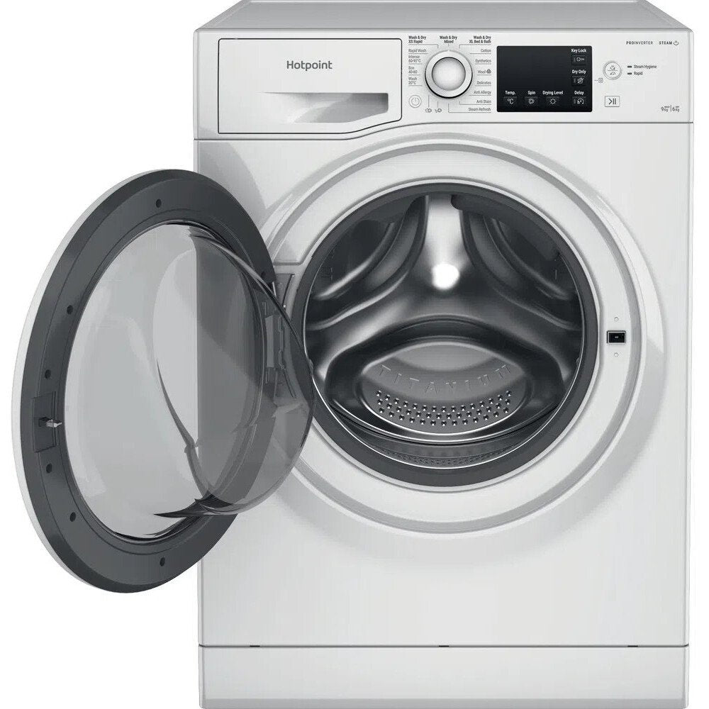 The Hotpoint NDBE9635WUK Washer Dryer offers a large 9kg capacity to clean your laundry and a 6 kg capacity for drying it while the 1400 spin speed will help to get your clothes clean in a flash and the Steam Refresh function is a dedicated cycle to freshen up any items which aren’t ready for a full wash yet.