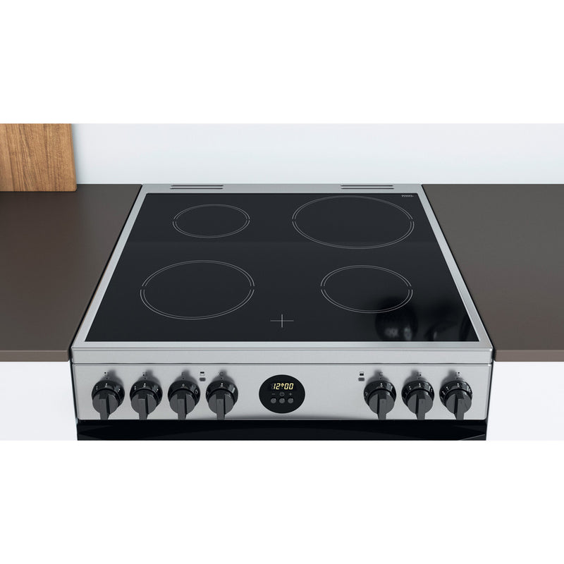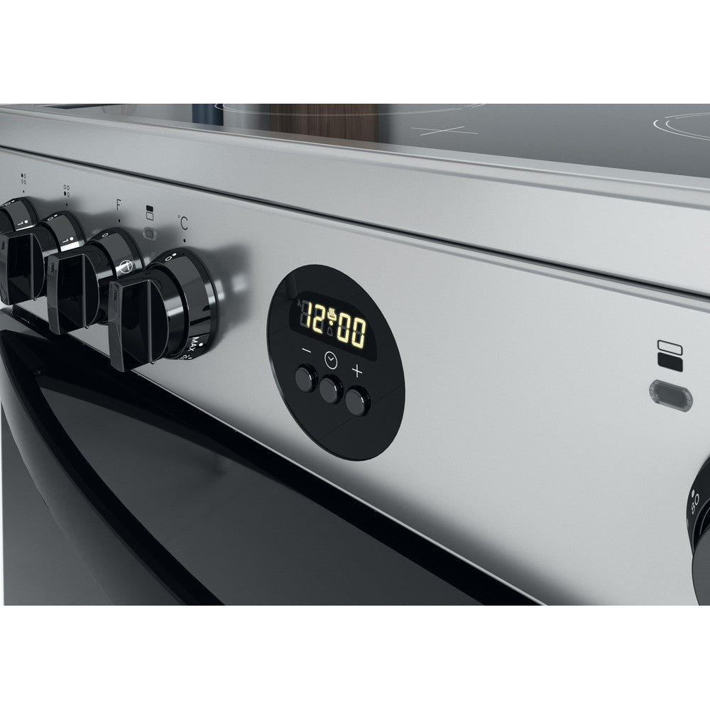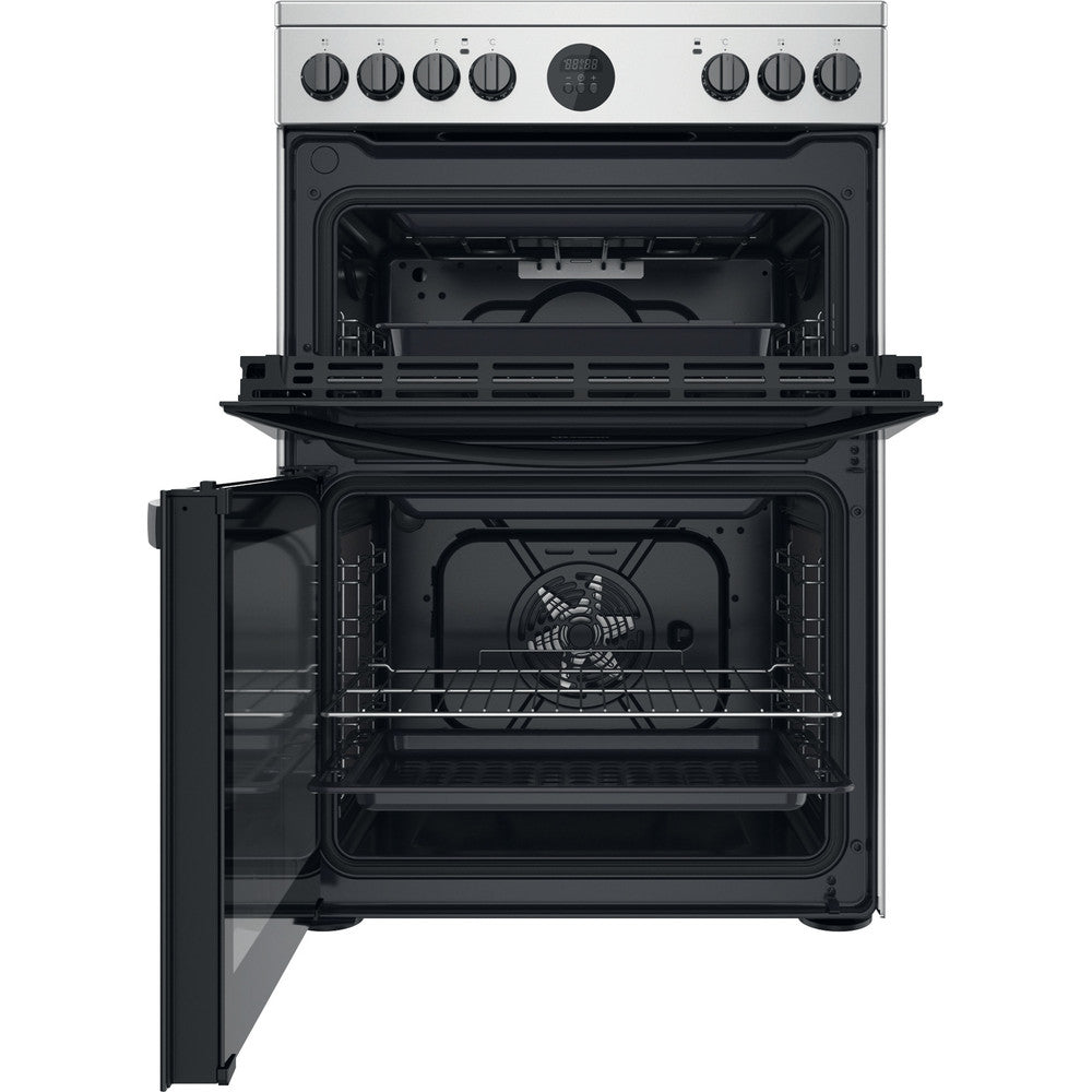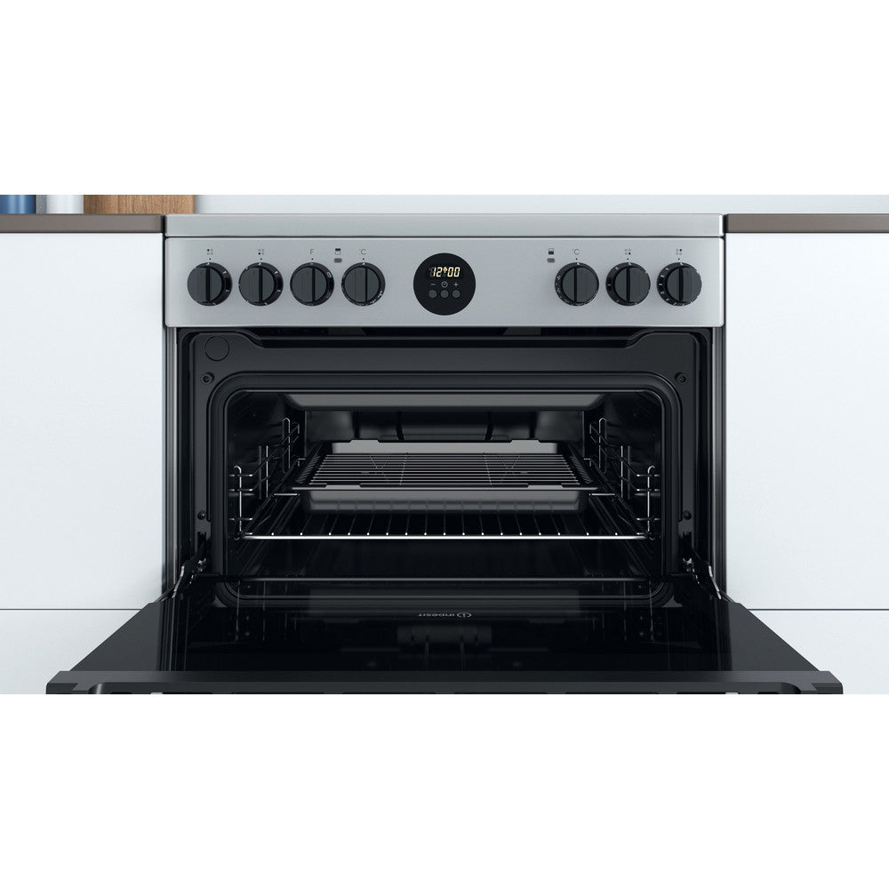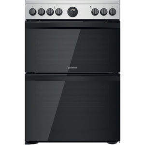 The Indesit ID67V9HCX Freestanding Electric Cooker in inox silver is a 60cm double oven with a four cooking zone ceramic hob. The main oven is fan assisted with a generous 77 litre capacity complete with a separate conventional top oven and grill offering a further 46 litre capacity. Cleaning the oven is a breeze thanks to the partial catalytic linings which absorb grease and grime and burns it off when the oven is heated to over 200 degrees.