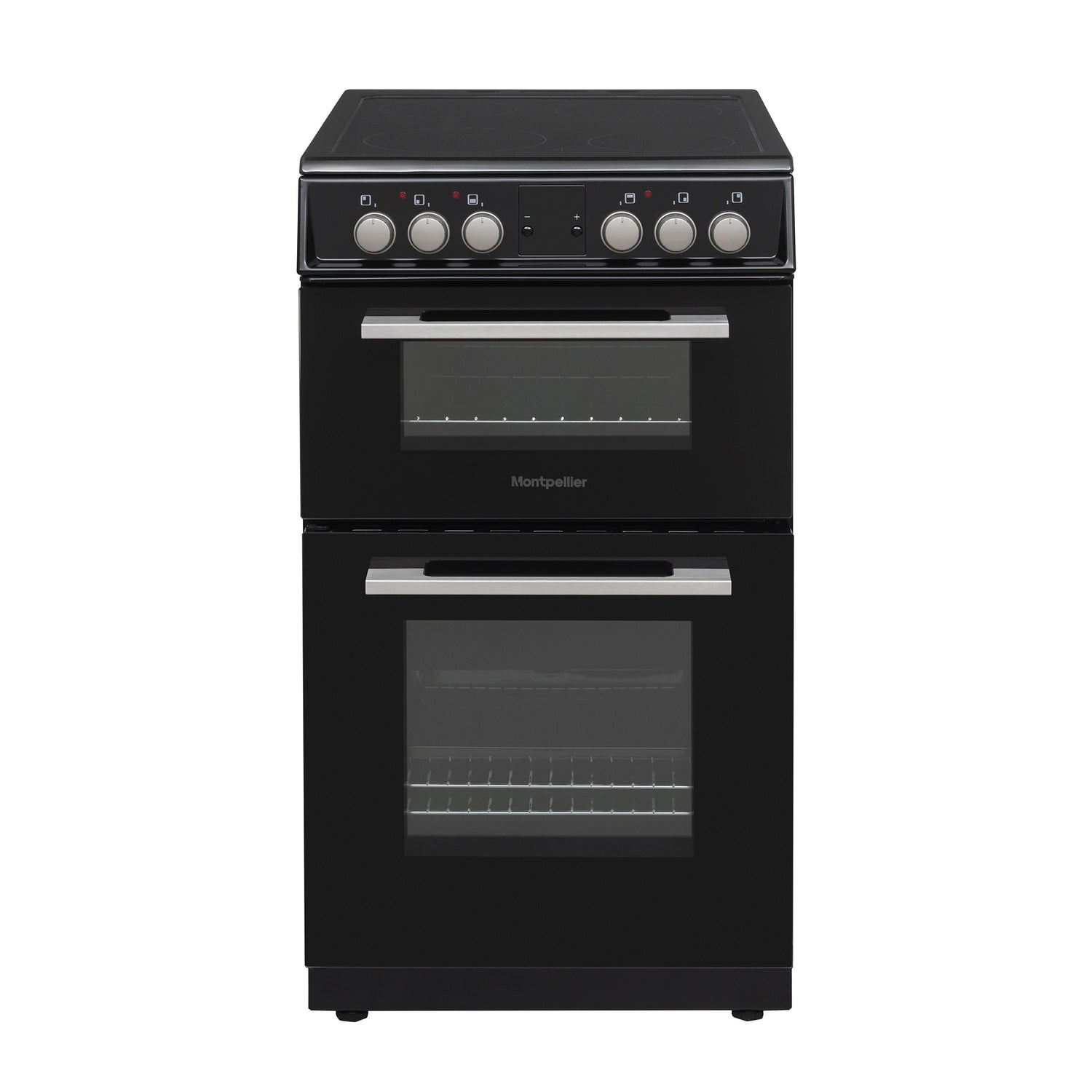 The Montpellier MDOC50FK Freestanding Electric Cooker is a 50cm wide double oven with grill and a four cooking zone ceramic hob with 6 heat levels and a hob hot warming light per zone.