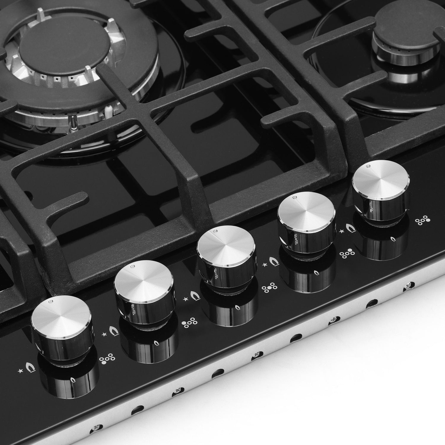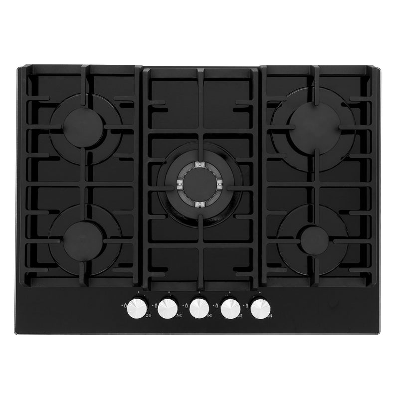 The Montpellier MGH75BG Gas on Glass Hob will add that wow factor to your work surface without breaking the bank. Including custom sturdy cast iron pan supports that helps to set this model apart from others on the market as well as offering durability and a contemporary style with five gas burners.