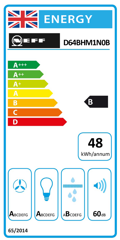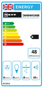 The Neff D64BHM1N0B 60cm Chimney Hood features LED lighting giving you clear illumination whilst cooking and adjustments can be easily made with a single finger thanks to the integrated flat surface of the control panel. This model features CleanAir that gives nothing but clean air thanks to the premium recirculation filter with high odour reduction and the max extraction rate is 368 m3/hr.
