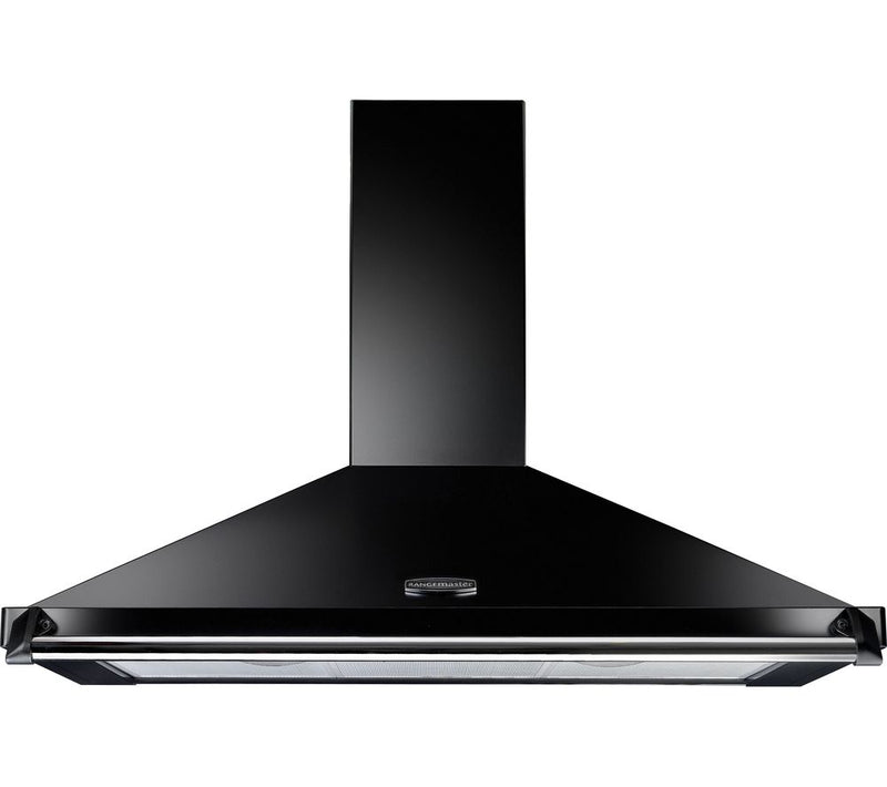 The Rangemaster CLAHDC90BC 90cm Chimney Hood is a 90cm classic range cooker hood in black with a chrome towel rail that will match many of Rangemaster Range Cookers. Featuring two spotlights and three speeds to adjust the fan inside which can all be controlled by a simple switch and slide motion under the cooker hood. The air circulates through both aluminium and charcoal filters in this hood to make sure that every unwanted particle (like grease and steam) is efficiently removed from the air and offers a max extraction rate of 440 m3/hr.