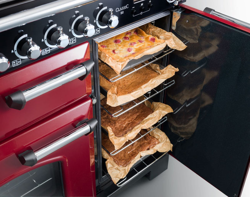 The Rangemaster Classic 100cm Dual Fuel Range Cooker with the traditional towel rail and chunky knobs, has a glide-out dual circuit variable grill and a handy rack that is attached to the main oven; both are for easier access whilst cooking. It also features a wok burner, cast iron pan supports and removable griddle.