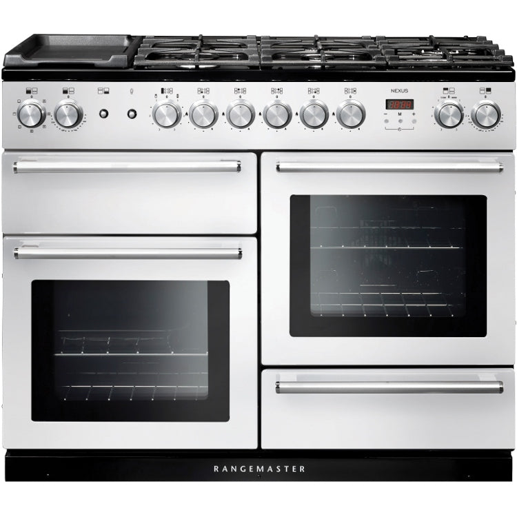 The Rangemaster Nexus 110cm Dual Fuel Range Cooker contemporary in design features diamond turned rotary controls, with a glide-out dual circuit variable grill, a handy rack attached to the main oven door and cast iron pan supports.