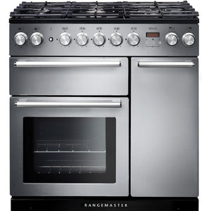 The Rangemaster Nexus 90cm Dual Fuel Range Cooker contemporary in design features diamond turned rotary controls, with a glide-out dual circuit variable grill, a handy rack attached to the main oven door and cast iron pan supports.