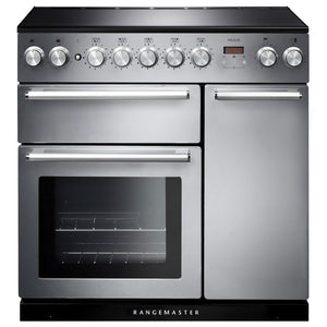 The Rangemaster Nexus 90cm Induction Range Cooker contemporary in design features diamond turned rotary controls, with a glide-out dual circuit variable grill, a handy rack attached to the main oven door and easy clean hob.