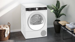 The Siemens WQ45G2D2GB Heat Pump Tumble Dryer offers efficient and gentle drying while reducing energy costs by up to 50%. Featuring advanced heat pump technology, it dries clothes at lower temperatures to prevent damage and shrinkage.