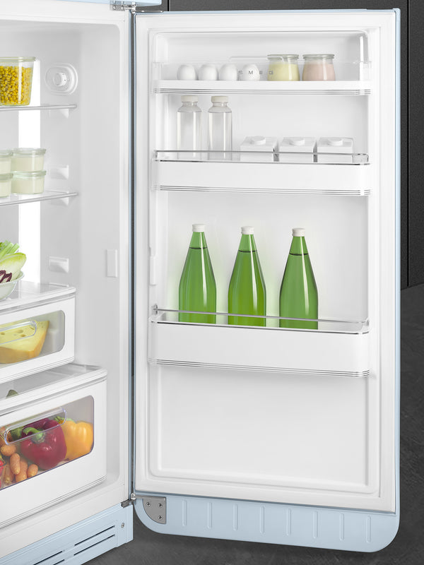 The Smeg FAB30RPB5 Retro Fridge Freezer in pastel blue with a right hand hinge is part of the iconic FAB30 coloured fridge freezers which have become a cult object of style and creativity thanks to the rounded curves and chrome details that perfectly coordinate the interior and exterior doors of the fridge freezer.