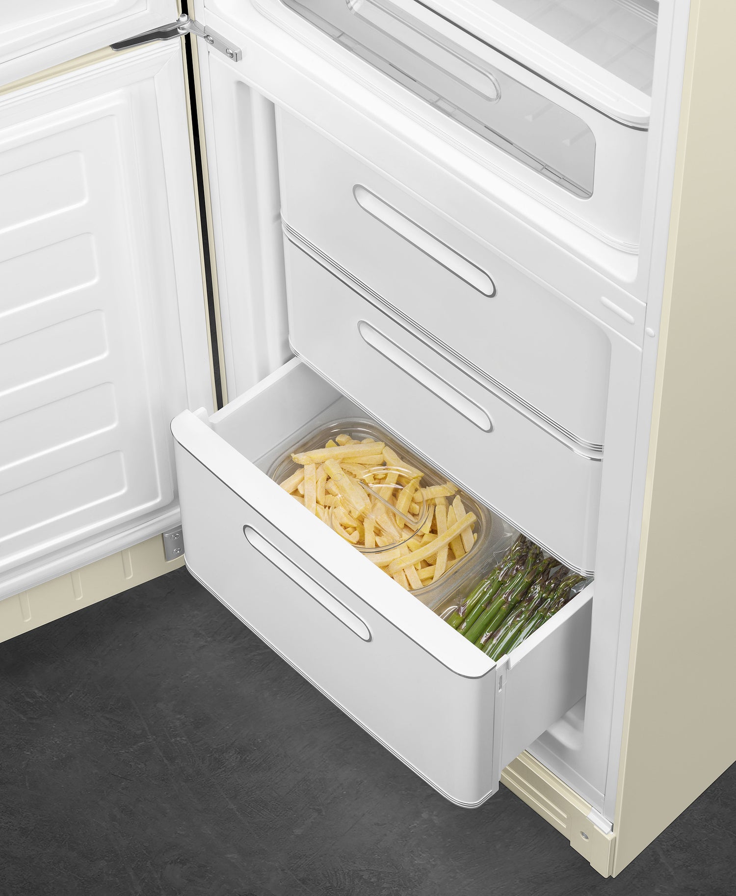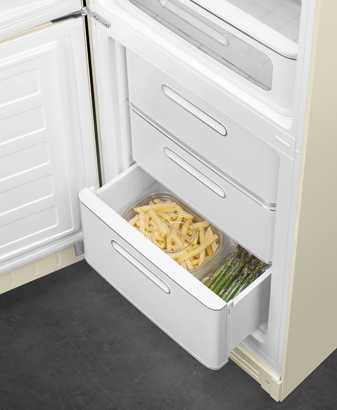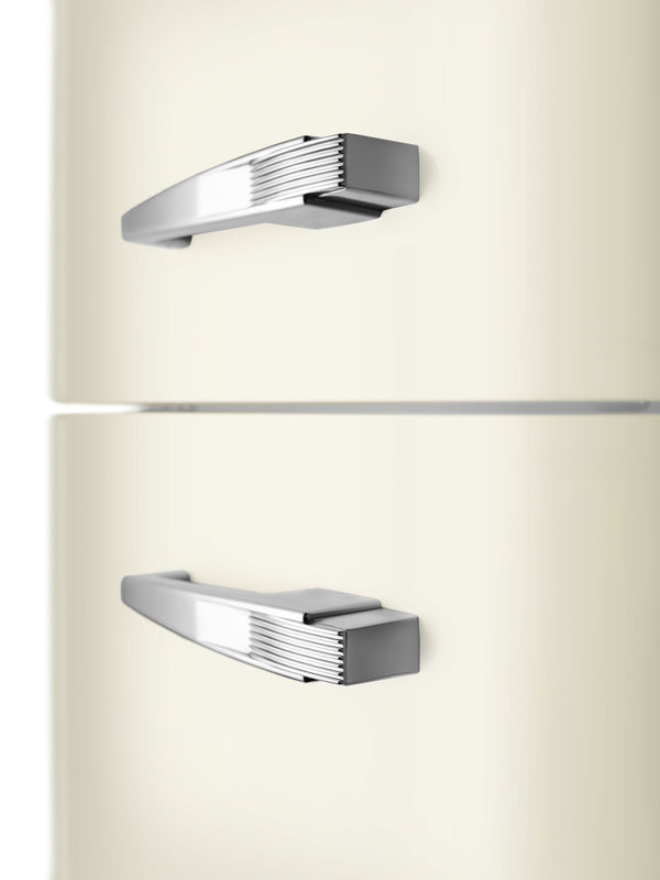 The Smeg FAB32LCR5 Retro Fridge Freezer in cream with a left hand hinge is part of the iconic FAB32 coloured fridge freezers which have become a cult object of style and creativity thanks to the rounded curves and chrome details that perfectly coordinate the interior and exterior doors of the fridge freezer.