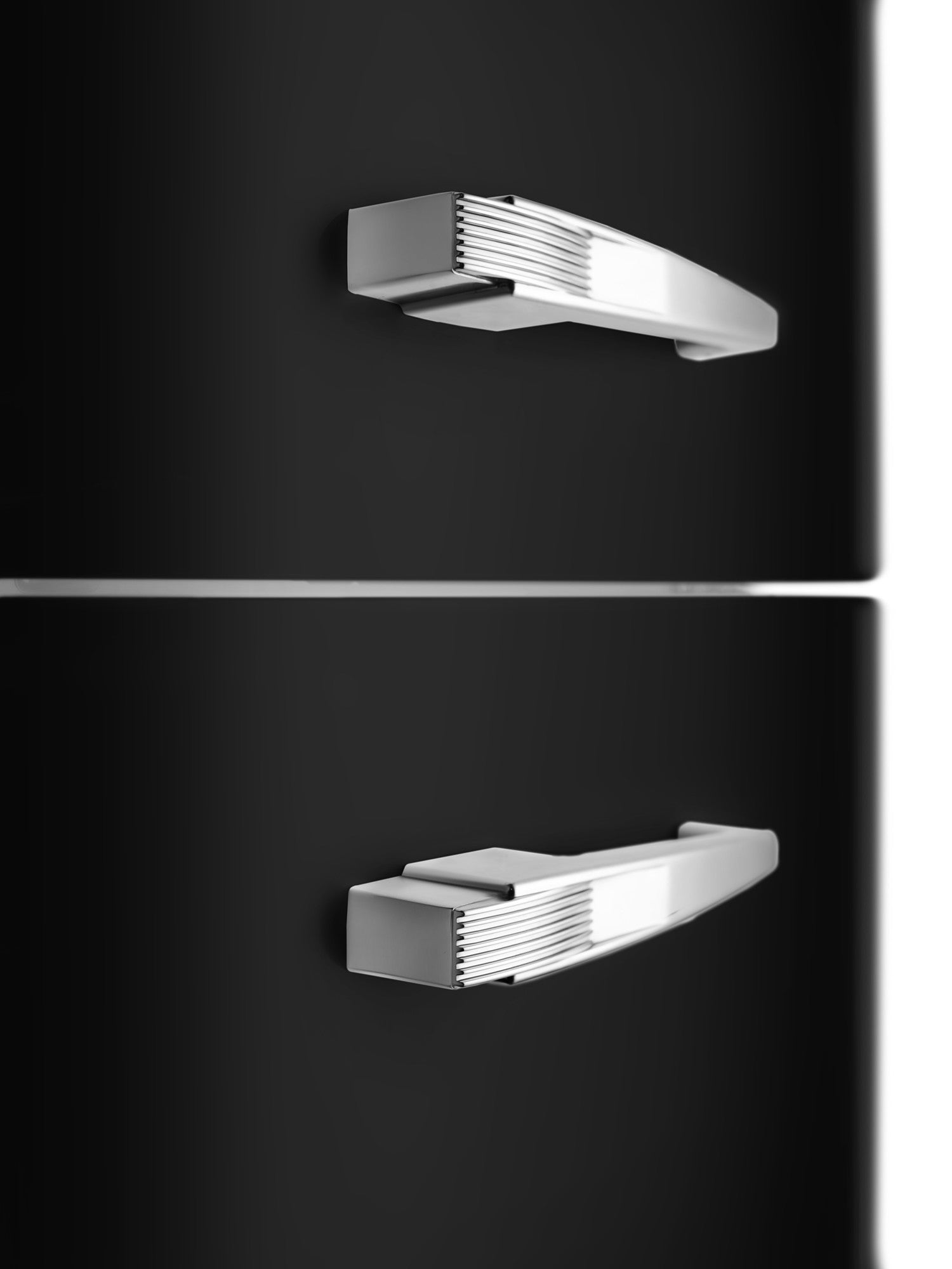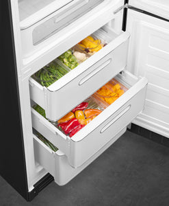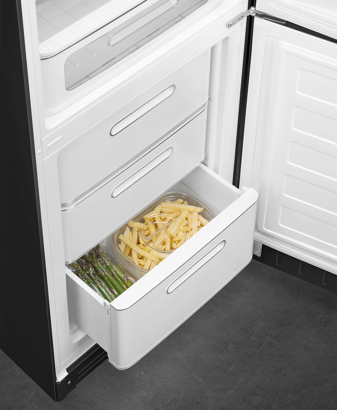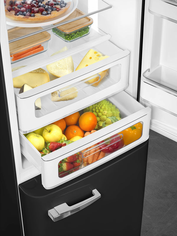 The Smeg FAB32RBL5 Retro Fridge Freezer in black with a right hand hinge is part of the iconic FAB32 coloured fridge freezers which have become a cult object of style and creativity thanks to the rounded curves and chrome details that perfectly coordinate the interior and exterior doors of the fridge freezer.