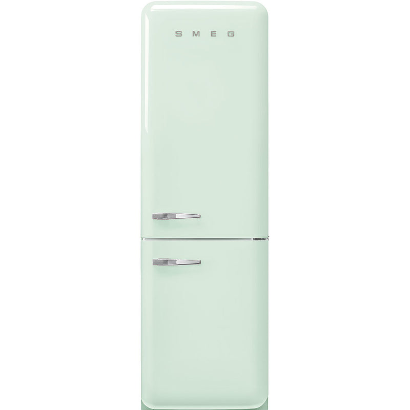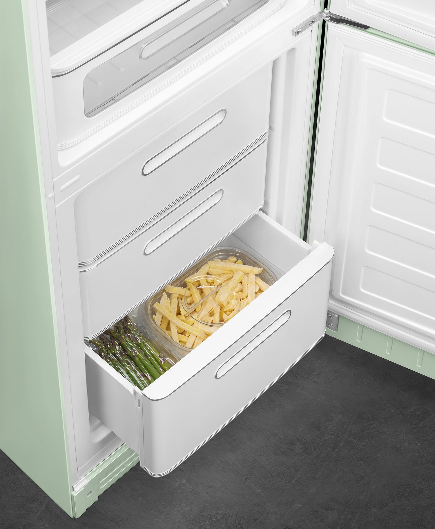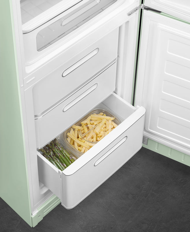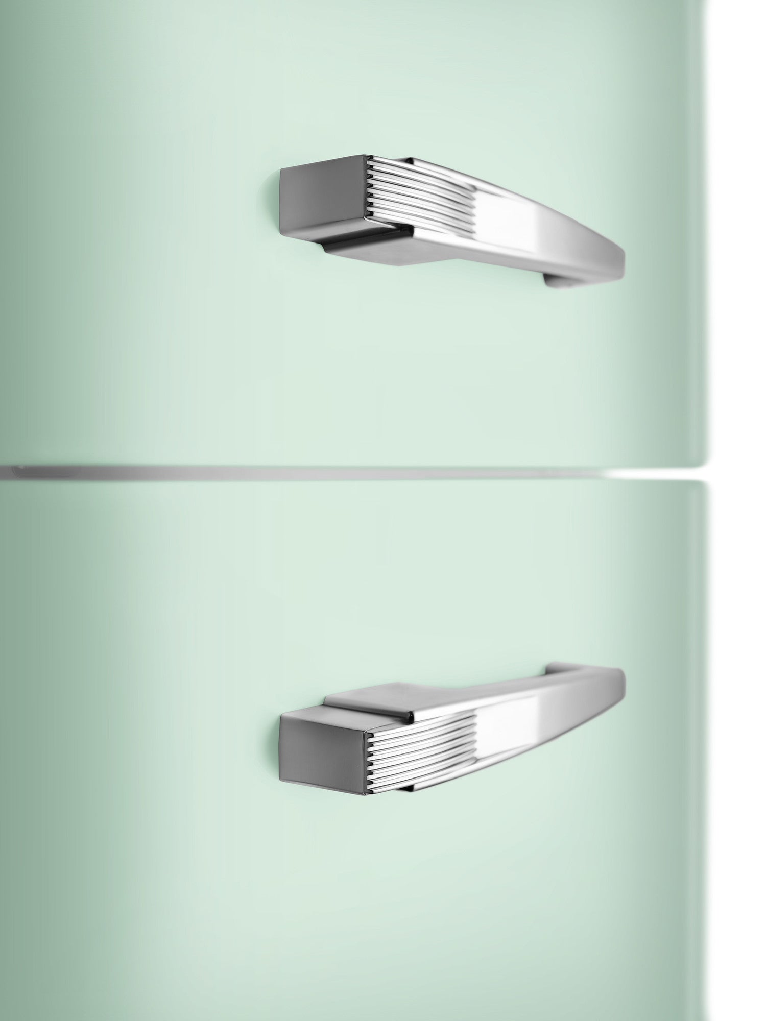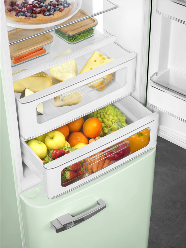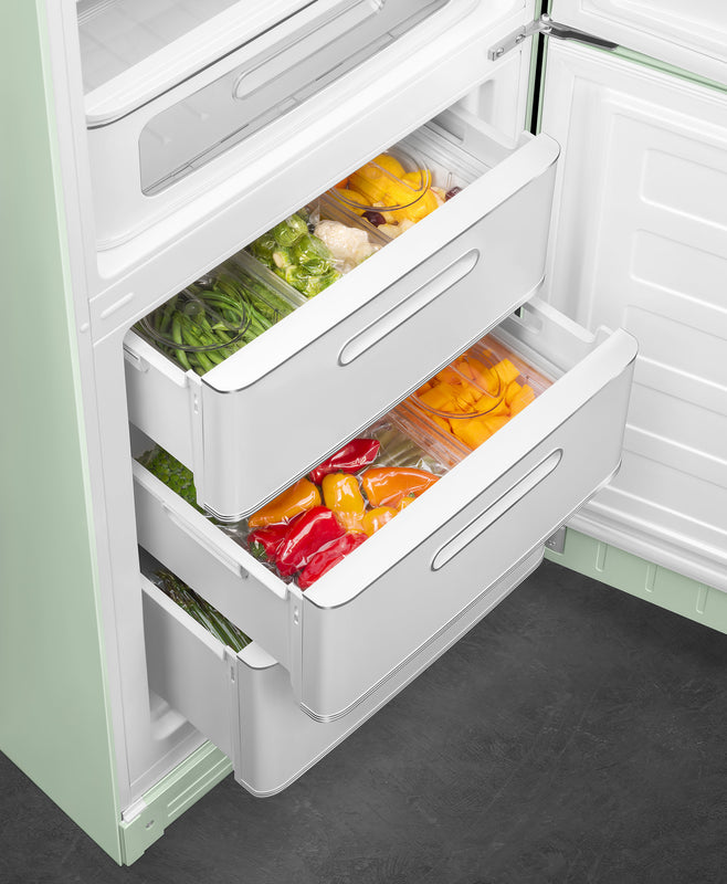 The Smeg FAB32RCR5 Retro Fridge Freezer in Pastel green with a right hand hinge is part of the iconic FAB32 coloured fridge freezers which have become a cult object of style and creativity thanks to the rounded curves and chrome details that perfectly coordinate the interior and exterior doors of the fridge freezer.