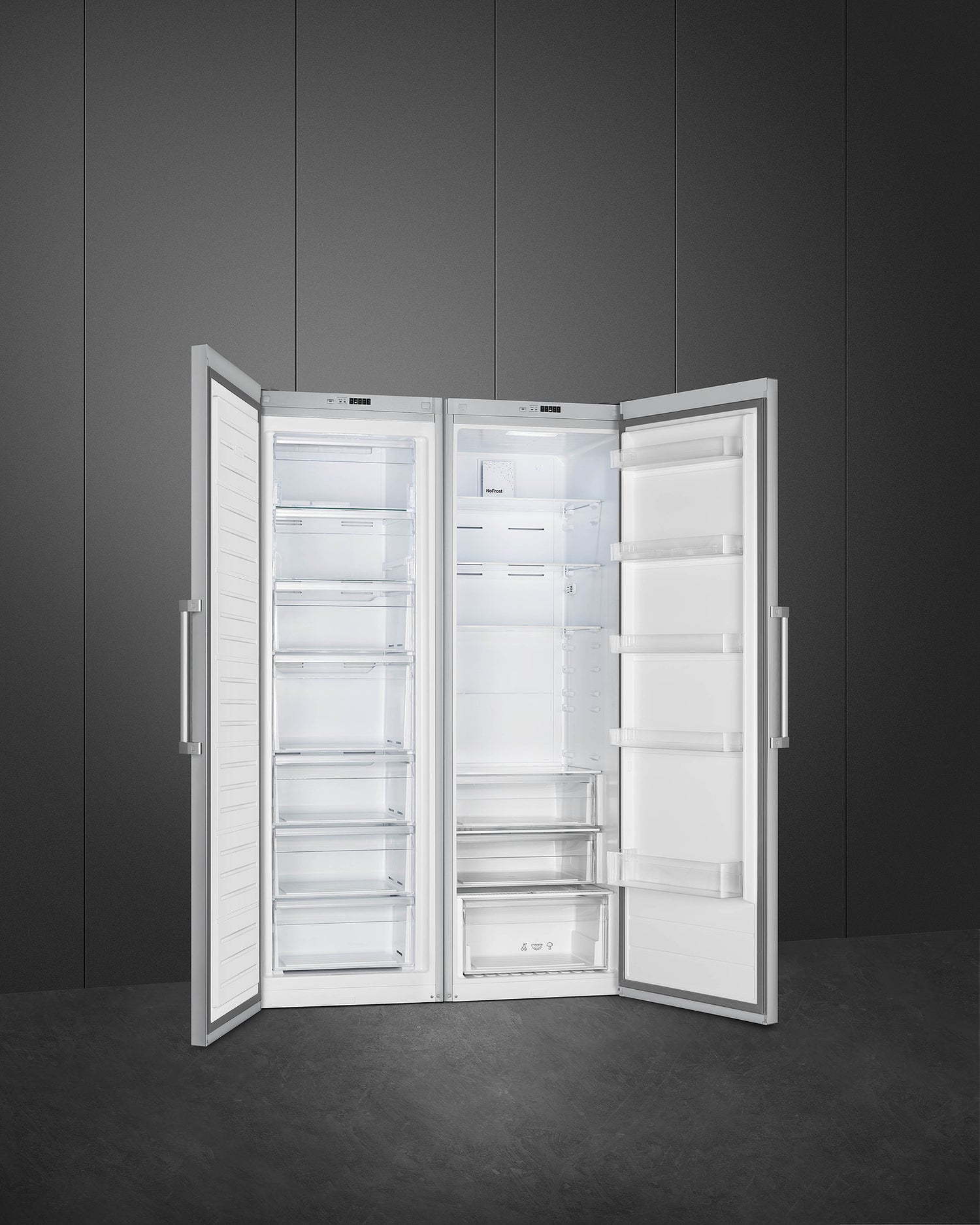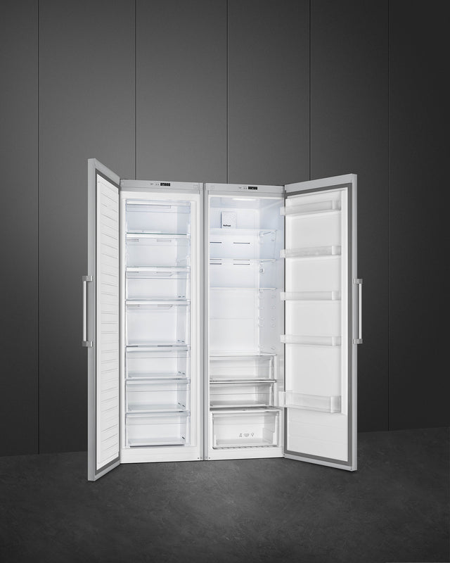 The Smeg UKFF18EN2HX Freestanding Tall Freezer is finished in stainless steel and offers an impressive 280 litre capacity giving you plenty of storage options across 5 drawers and 2 door balconies which takes care of all your bottles, jars and smaller items. The LED light provides excellent illumination so you can find exactly what you want and this model features Freezer Shield meaning it will work in ambient temperatures of -15C so can be used in garages and outbuildings.