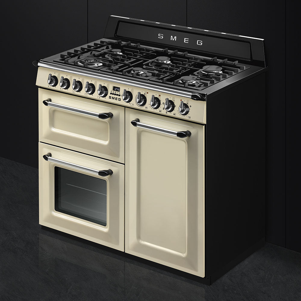 The Smeg Victoria 100cm Dual Fuel Range Cooker in a timeless design that has a touch of 50's nostalgia, with a wok burner, cast iron pan supports and anti overflow system to help keep your hob free from stubborn stains.