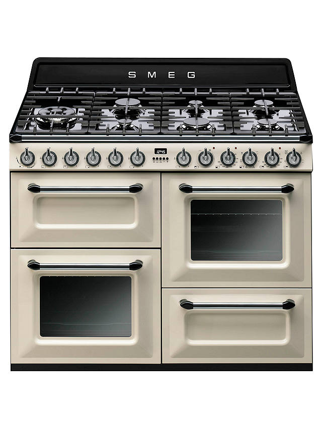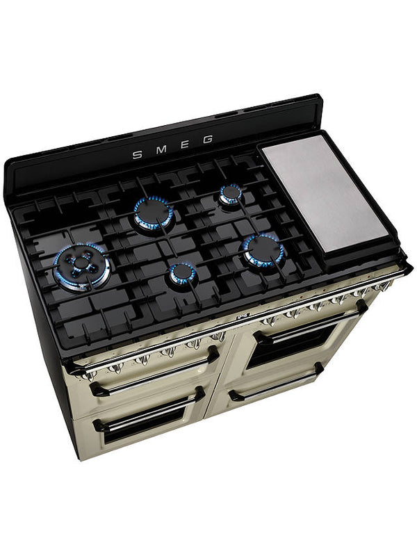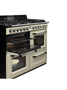 The Smeg Victoria 110cm Dual Fuel Range Cooker in a timeless design that has a touch of 50's nostalgia, with a wok burner, cast iron pan supports and anti overflow system to help keep your hob free from stubborn stains.