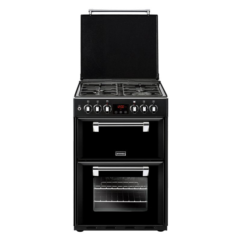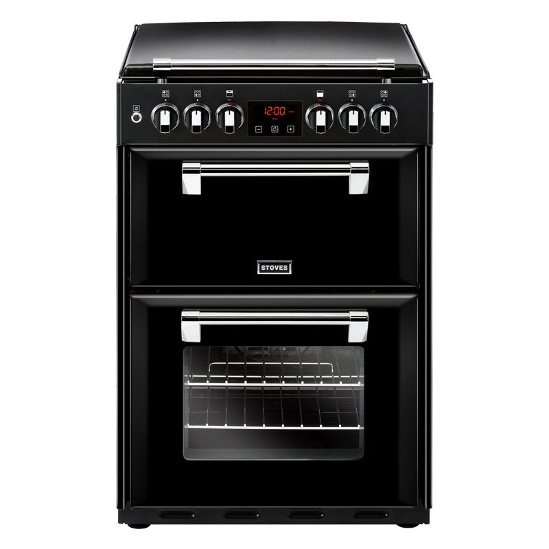 The Stoves Richmond 444444723 Freestanding Dual Fuel Cooker is a stunning British made appliance in a black finish featuring two electric ovens, cast iron lid and a four cooking zone gas hob with cast iron pan supports and a flame safety device on each zone.