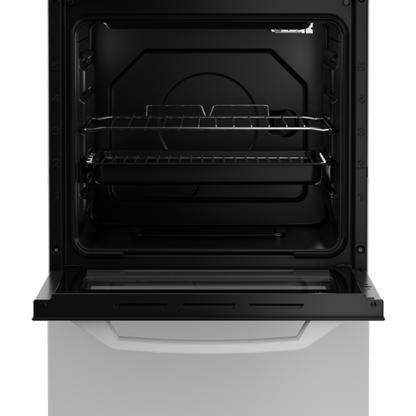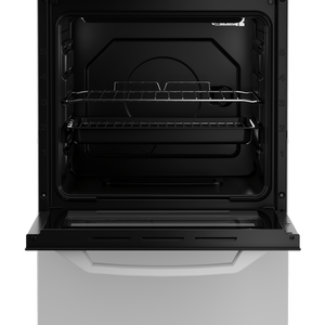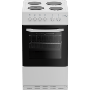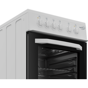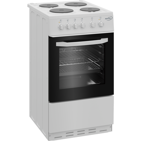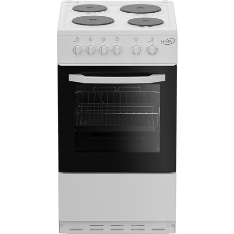 The Zenith ZE503W Freestanding Electric Cooker is a 50cm single cavity oven with an impressive 60 litre capacity and four solid plate cooking zones with conventional type heating and a fixed rate grill. Cleaning is made easy thanks to the enamel lined interior that can easily be wiped down after use.